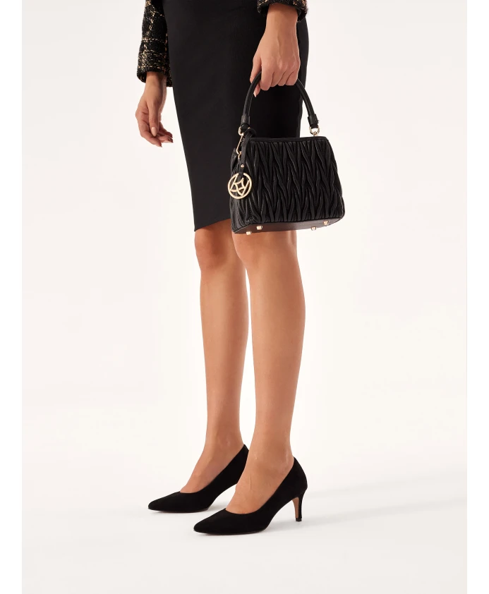 Туфли-Лодочки на низком каблуке имеют минималистичный и универсальный стиль. Стройный верх с заостренным мыском подчеркивает стройность стопы, а мягкая замша обеспечивает оптимальную посадку. Черные туфли на шпильке – элегантный предмет гардероба, гарантирующий безупречный образ. Подкладка изготовлена из мягкой полуанилиновой овчины, которая отличается отличным впитыванием влаги и обеспечивает высокий уровень комфорта. Подошва изготовлена из тунисской кожи, которая отличается долговечностью и эстетичным внешним видом.