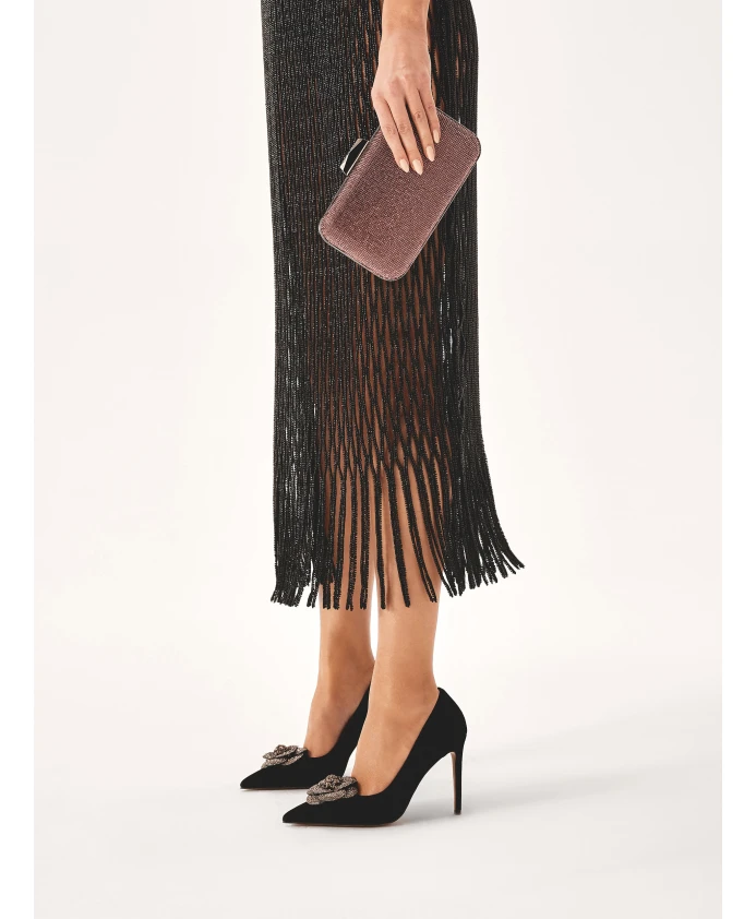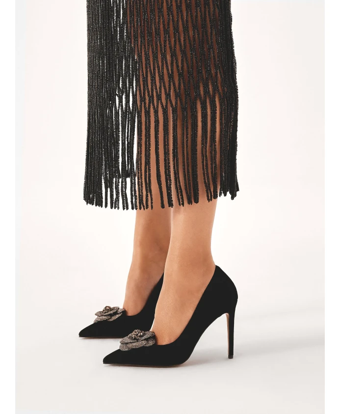 Классические туфли-лодочки из мягкой замши – исключительно женственная и очаровательная модель. Передняя часть туфель украшена блестящим цветком, подчеркивающим элегантный вечерний характер обуви. Крошечные серебряные кристаллы, покрывающие лепестки цветка, создают поразительный контраст с черной матовой замшей. Шикарные туфли-лодочки прекрасно сочетаются с вечерними творениями и праздничными комплектами. Миниатюрная подошва отличается прочностью и эстетичным внешним видом. Он украшен металлической монограммой с черным кристаллом. Подкладка из полуанилиновой овчины обеспечивает исключительный комфорт благодаря отличным свойствам поглощения влаги.