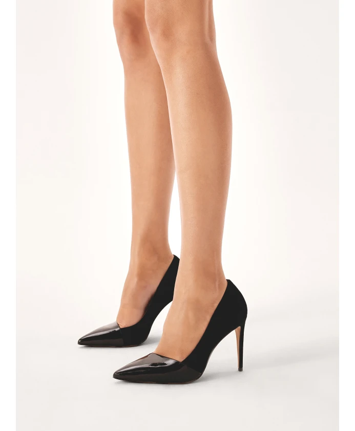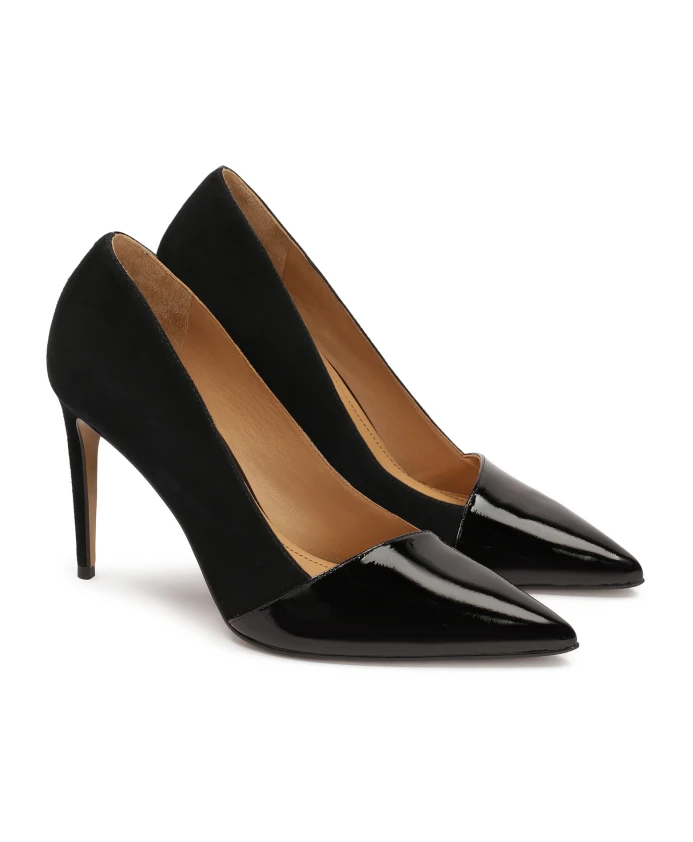 Черные туфли из лакированной кожи и замши – исключительно элегантная модель, которая выглядит очень оригинально благодаря нежному сочетанию контрастных видов кожи. Матовая поверхность замши интересно гармонирует с блестящей лакированной кожей. Черные универсальные туфли на шпильке – это квинтэссенция элегантности, шика и высокого качества исполнения. Подкладка изготовлена из очень мягкой полуанилиновой овчины, что обеспечивает максимальный комфорт. Подошва из тунисской кожи отличается прочностью и эстетичным внешним видом.