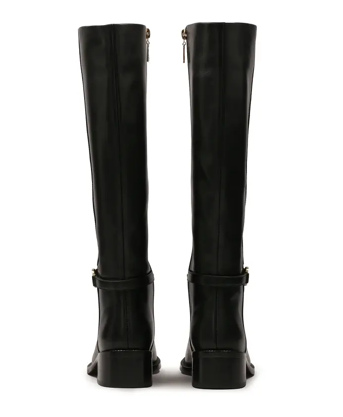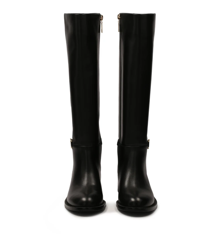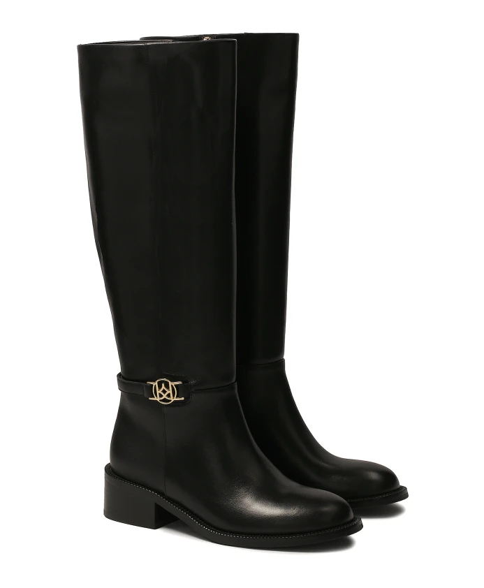 Черные ботинки из натуральной кожи излучают простоту и элегантность и идеально вписываются в минималистические тенденции. В их дизайне основное внимание уделяется чистым линиям и высококачественным материалам, что делает их вечным дополнением вашего гардероба. Отличительной особенностью является широкий плоский каблук, который обеспечивает устойчивость и комфорт, добавляя элегантности общему образу. Высокая голенища с длинной молнией легко надевается и обеспечивает дополнительную защиту от холода. Боковая часть верха украшена тонкой полоской с металлической монограммой, придающей туфлям уникальный характер и изысканный вид. Мягкая подкладка из овчины гарантирует высокий комфорт, а подкладка из тканевого меха создает ощущение тепла в холодные дни.