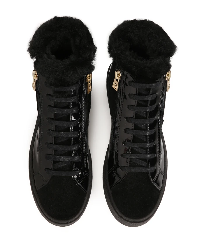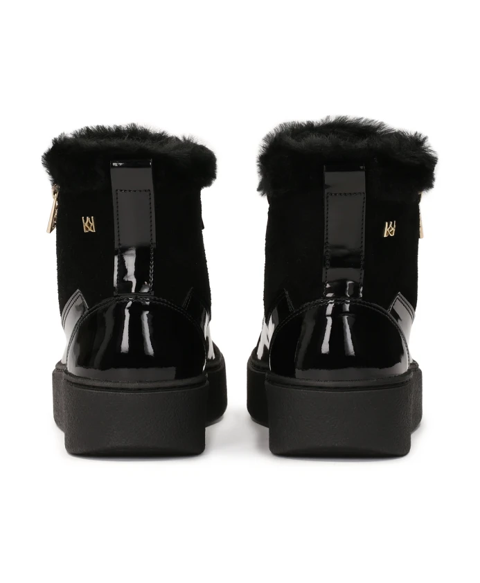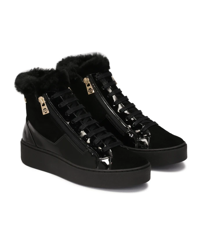 Черные кроссовки в осенне-зимнем варианте сочетают в себе функциональность и стиль. Это идеальное решение для тех, кто не хочет лишиться комфорта и модного образа даже в холодные дни. Они изготовлены из двух видов кожи: мягкой замши и лакированной кожи, которые в совокупности создают уникальный дизайн. Высокий голенище и утеплитель сохранят ваши ноги в тепле и защитят от холода даже в самые холодные дни. Классическая черная цветовая гамма позволяет легко сочетать обувь с разными стилями. Подкладка из полуанилиновой козьей кожи обеспечивает исключительный комфорт благодаря отличным свойствам поглощения влаги.