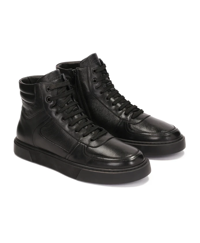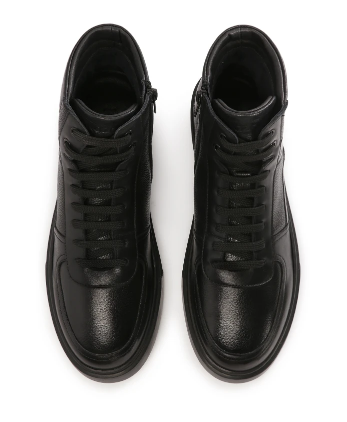 Мужские кроссовки с высоким голенищем из натуральной кожи – удобная и функциональная обувь, идеальная для прохладных дней. Голенище оснащено застежкой-молнией и шнуровкой для обеспечения удобного надевания и точной посадки на ноге. Многочисленные швы придают обуви стильный и динамичный вид, одновременно укрепляя конструкцию. Кроссовки частично утеплены, что обеспечивает тепловой комфорт и дополнительное тепло, позволяя ногам дышать. Высокий голенище выше лодыжки обеспечивает дополнительную поддержку и защиту, идеально подходящую для повседневного использования. Натуральная кожа, из которой изготовлена обувь, прочная и элегантная, а классический дизайн делает эти кроссовки универсальным дополнением ко многим нарядам. Мягкая подкладка из овчины гарантирует высокий комфорт, а текстильная меховая подкладка согревает в холодные дни.