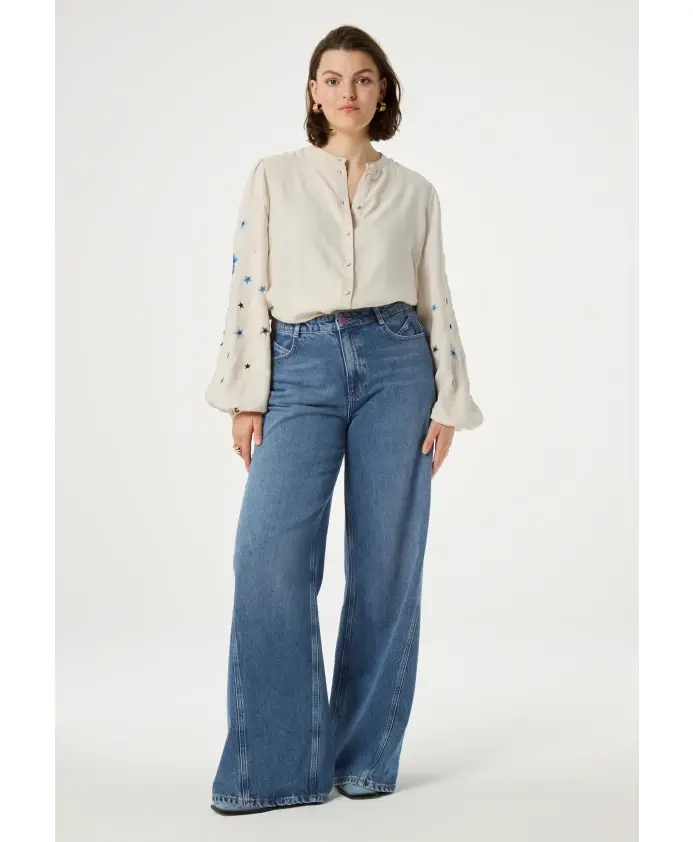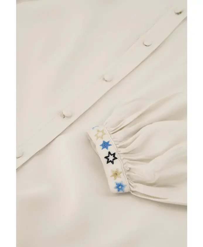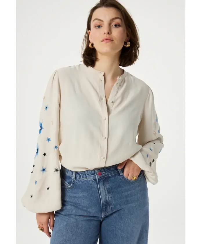 Эта белая женская блузка украшена вышивкой в виде синих звезд на рукавах. Эта модель с пышными рукавами, обтянутыми тканью пуговицами и плоским воротником изготовлена из 100% вискозы FSC, что делает ее одной из наших наиболее экологичных моделей. Сочетайте его с нашими широкими джинсами Lucy, чтобы создать стильный и элегантный образ.