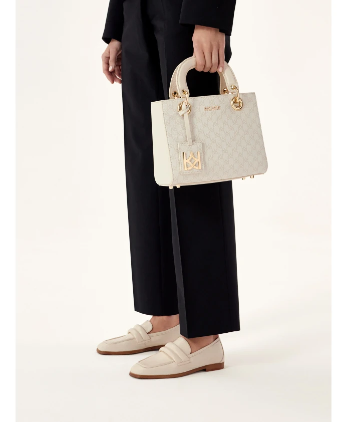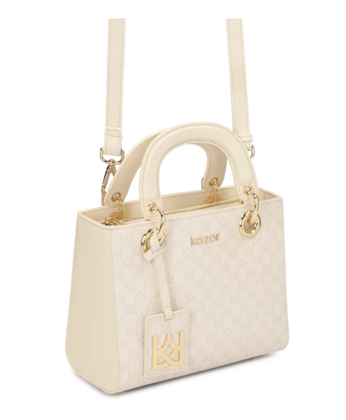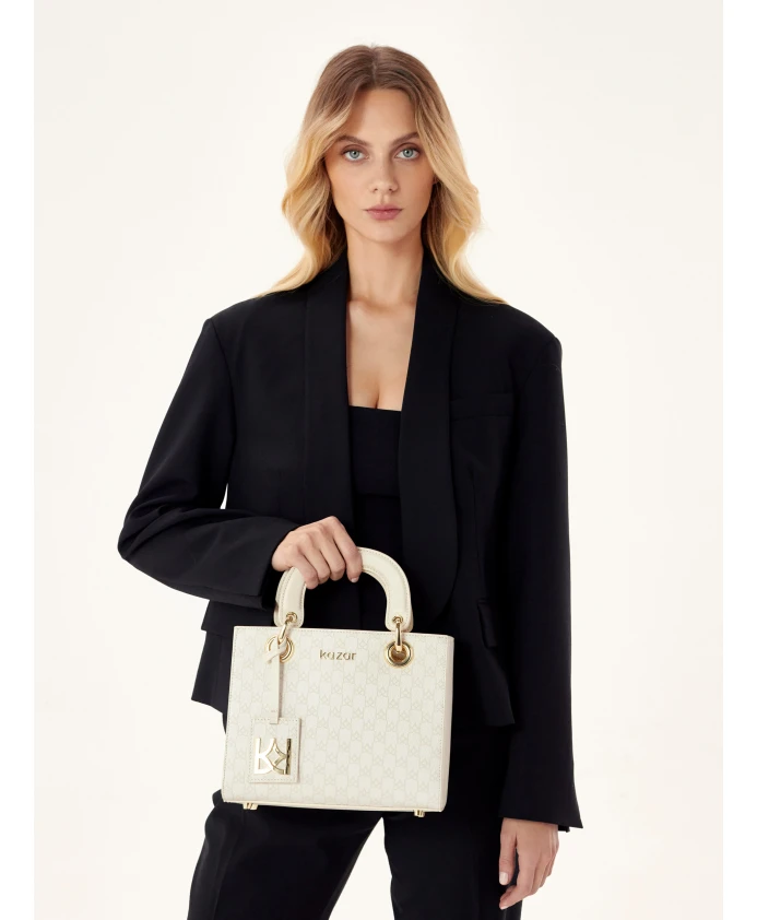 Сумка из высококачественной лицевой кожи – феноменальная модель, подходящая для различных случаев и нарядов. Кожа кремового цвета украшена узором из бежевых вензелей KAZAR. Сумка имеет прочную конструкцию, которая гарантирует безупречный внешний вид независимо от содержимого. Два типа ручек позволяют носить сумку разными способами, делая ее использование комфортным. Представленная модель – это классика, которая никогда не выходит из моды. Подробности о товаре: Сумка имеет 1 отделение на молнии. Внутри 2 открытых кармана и 1 карман на молнии. У сумки металлические ножки. Съемный ремешок регулируется.