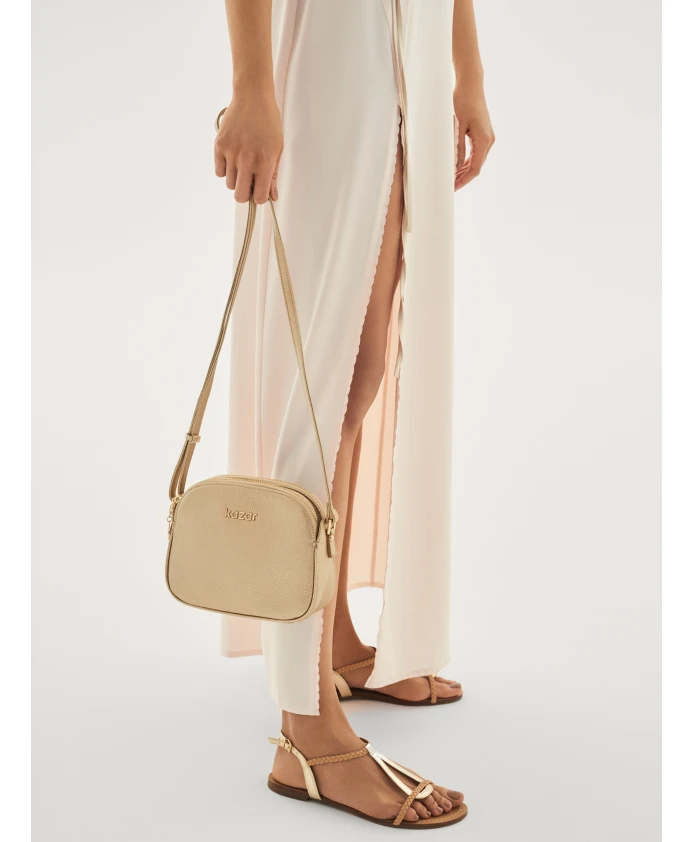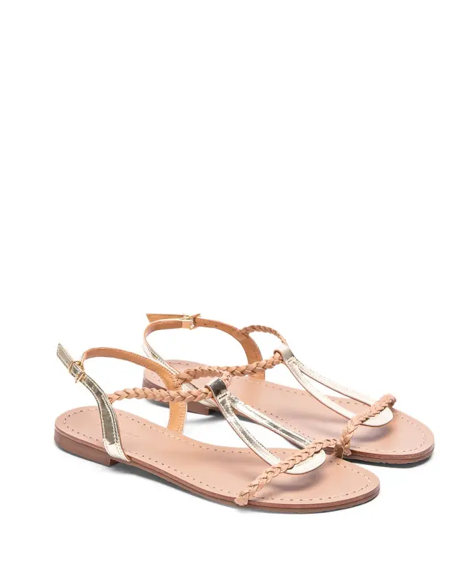 Женские золотистые босоножки из высококачественной лицевой кожи с синтетическими элементами. Они представляют интересный дизайн, созданный путем объединения двух материалов. Кожаная подкладка обеспечивает комфорт при ходьбе.