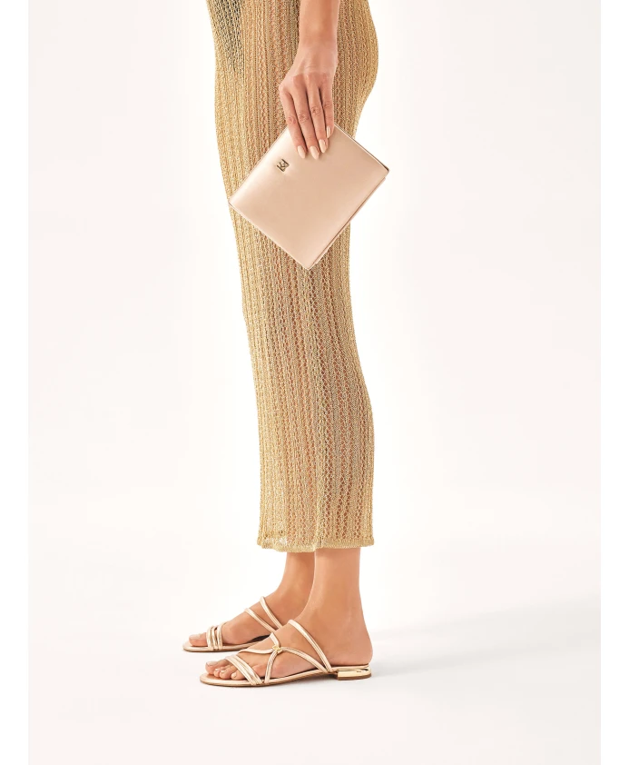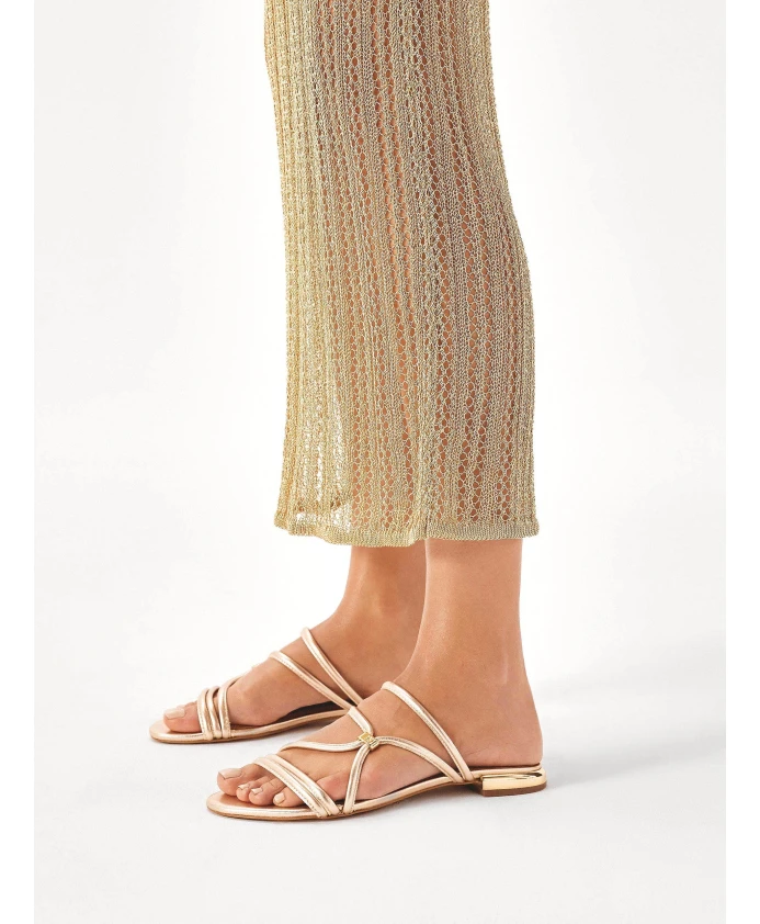 Мюли золотого цвета на тонком плоском каблуке — это современный крой, который можно носить двумя способами. Такую особенность обеспечивает тонкий ремешок, который можно сдвинуть вперед и носить как слипоны или отодвинуть назад на пятке и носить как сандалии. Многофункциональную летнюю обувь можно легко сочетать с разными стилями. Шпоновая кожа шикарного золотого тона прекрасно сочетается с металлическими элементами. Подкладка из полуанилиновой овчины гарантирует гигиенические условия и высокий уровень комфорта. Подошва изготовлена из тунисской кожи, которая отличается долговечностью и эстетичным внешним видом.
