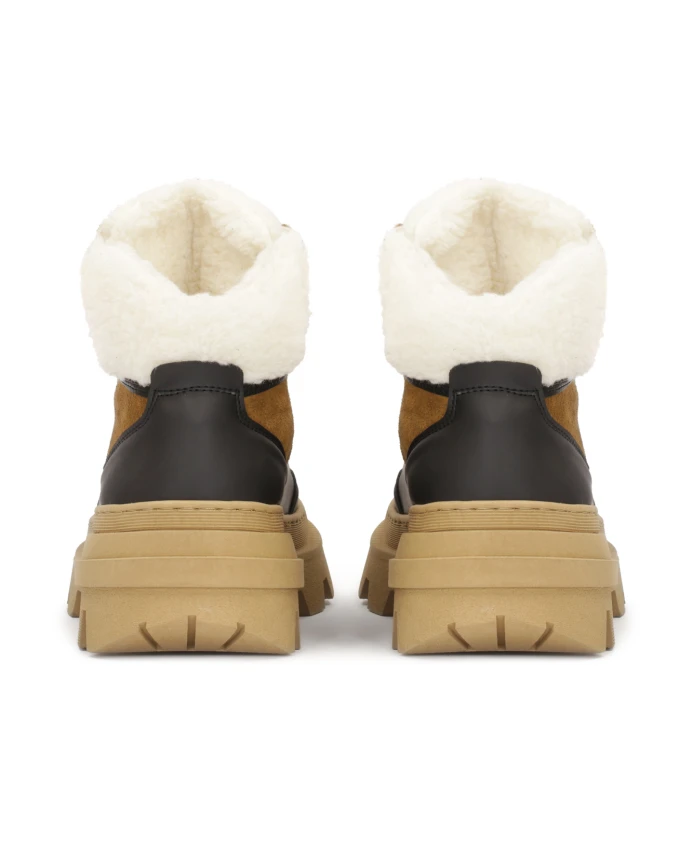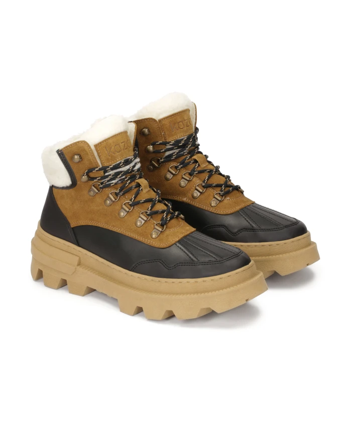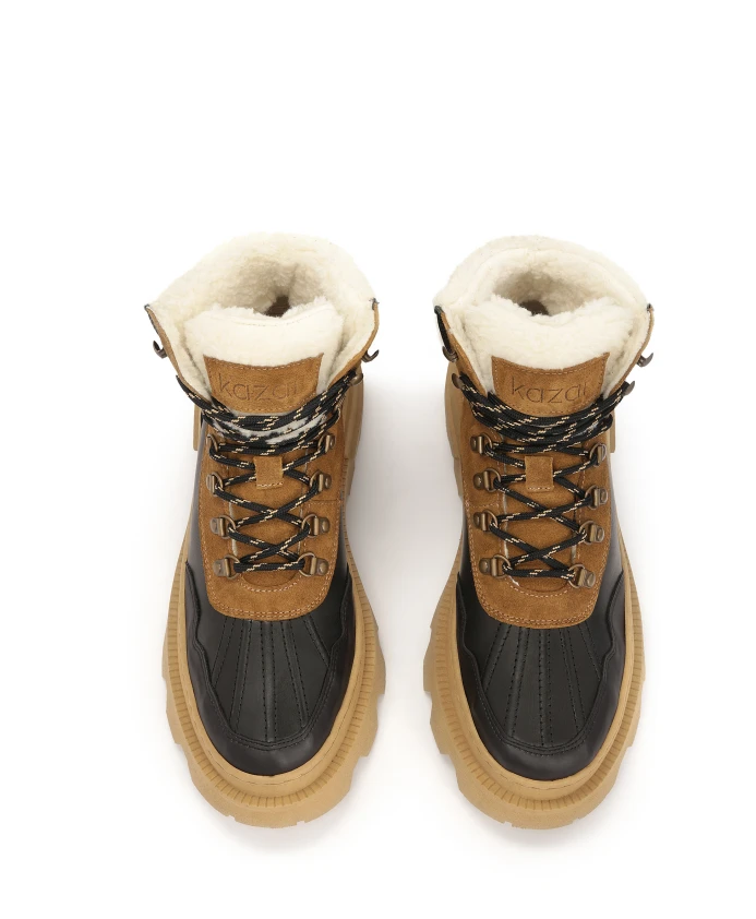 Сапоги, изготовленные из высококачественной замши и лицевой кожи, впечатляют оригинальным дизайном. Верх, сочетающий в себе материалы разных фактур и цветов, выглядит авангардно и современно. Сапоги-траппер – удобное, но очень модное дополнение осенне-зимнего гардероба, которое легко скрасит любой унылый классический наряд. Подкладка из натуральной кожи гарантирует высокий комфорт, а тканевая меховая подкладка обеспечивает ощущение тепла в холодные дни.