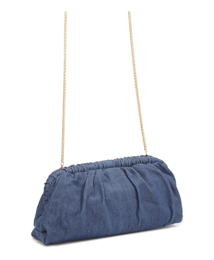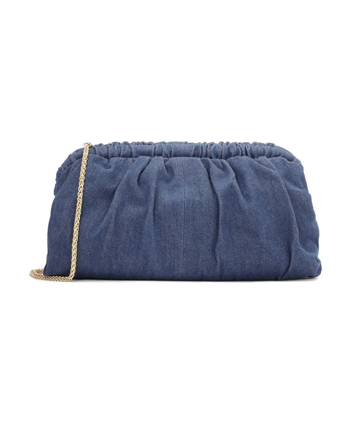 Пуховая сумка представляет собой покрой свободной формы со складками на застежке, напоминающими легкое, мягкое облако. Представленная сумка изготовлена из ткани а-ля Джинс синего цвета. Этот оригинальный аксессуар в стиле кэжуал понравится женщинам, которые любят привносить в свой образ нотку небрежности и сдержанной раскованности. Подробности о товаре: Сумка имеет 1 отделение, закрытое металлическим каркасом. Внутри 1 карман на молнии. В комплект поставки сумки входит съемная нерегулируемая цепочка.