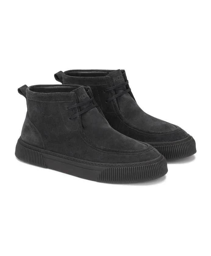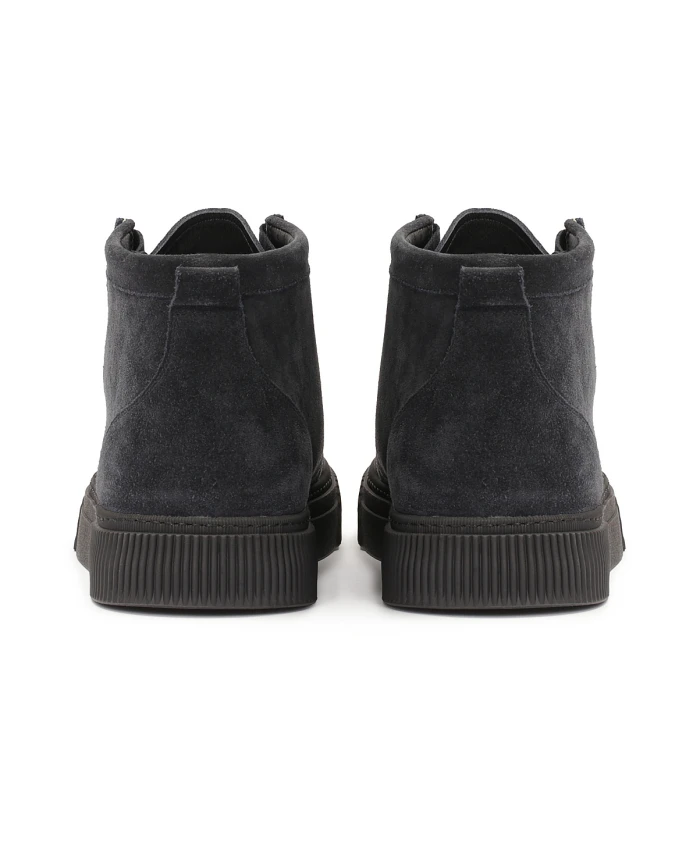 Мужские высокие кроссовки из темно-синей замши — идеальное сочетание стиля и комфорта для прохладных дней. Голенище туфель однотонное, с короткой шнуровкой, что обеспечивает удобство обуви, возможность быстрого надевания и снятия. Темно-синий цвет замши придает ей элегантности, делает ее универсальной и легко сочетаемой с разными стилями. Фирменная толстая строчка на передней части туфель придает им уникальный вид и добавляет тонкий декоративный штрих. Кроссовки поставлены на типичную для этого типа обуви плоскую подошву, обеспечивающую комфорт и устойчивость при ходьбе. Обувь утеплена, что делает ее отличным выбором для прохладных дней и обеспечивает дополнительный уровень тепла и комфорта. Идеальные для повседневного использования, они хорошо сочетаются с повседневной и спортивной одеждой, придавая им современный и элегантный вид. Подкладка обуви из овчины гарантирует гигиенические условия и исключительный комфорт.