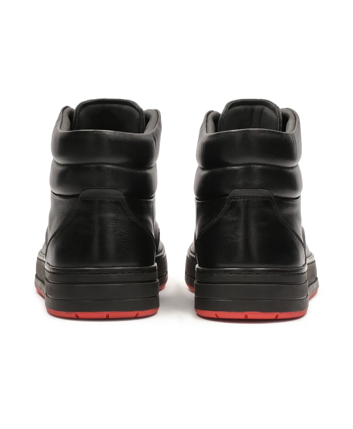 Черные мужские кроссовки из натуральной кожи отличаются современным и элегантным дизайном. Высокий голенище обуви обеспечивает дополнительную поддержку лодыжки, а стеганая прострочка вокруг лодыжки придает стильный акцент и повышает комфорт. Обувь оснащена шнурками, которые обеспечивают точную посадку на ноге и устойчивость при ходьбе. Контрастным элементом является красная подошва, которая придает обуви неповторимый характер и привлекает внимание. В результате получилась модная, но функциональная модель, идеальная для повседневного использования. Мягкая подкладка из овчины гарантирует высокий комфорт, а текстильная меховая подкладка создает ощущение тепла в холодные дни.