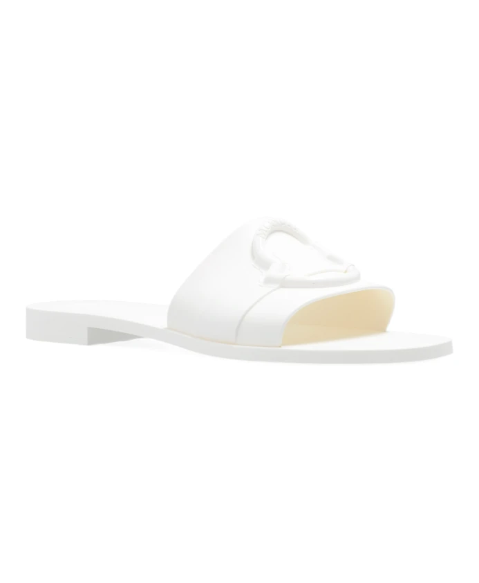 Белые шлепанцы от Moncler. Модель изготовлена из каучука и украшена аппликацией в виде логотипа спереди. Высота подошвы: 1 см. Высота подошвы в самой высокой точке: 2 см.