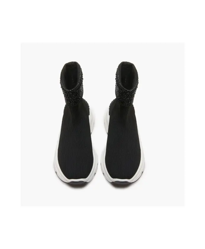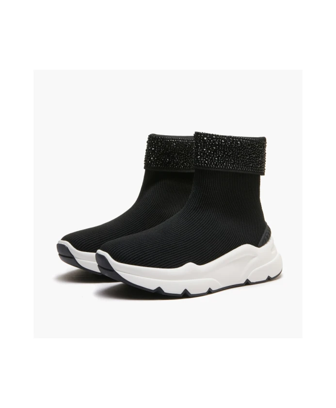 Женские кроссовки Emanuelle Vee Zoe с манжетами посередине и стразами горячей фиксации. Мягкая съемная кожаная подошва, двухцветная подошва толщиной 5,5 см.