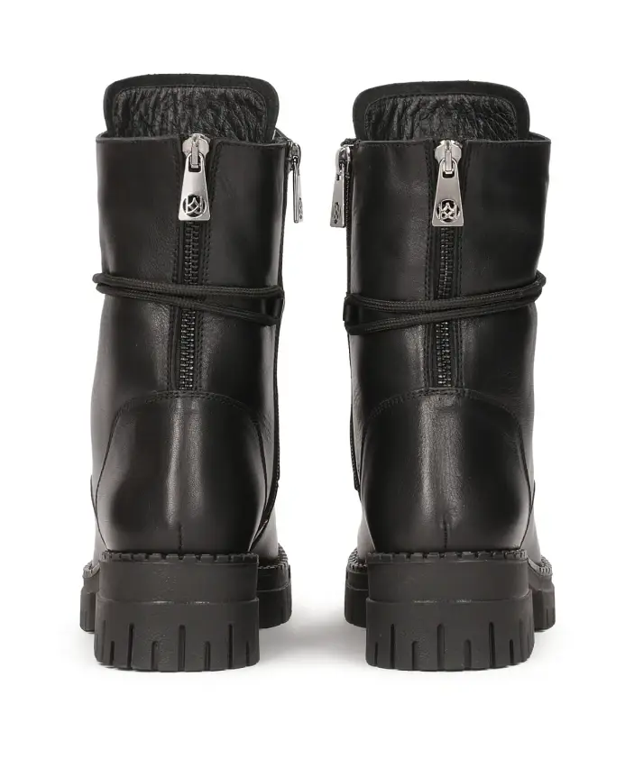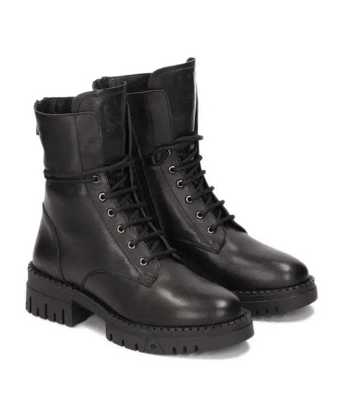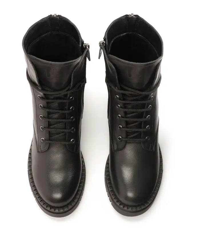 Сапоги простого дизайна изготовлены из натуральной кожи, что повышает их долговечность и эстетическую ценность. Помимо молнии для удобства надевания, голенище длиной до щиколотки также имеет низкую шнуровку и декоративную молнию сзади. Простые ботинки на толстой подошве прекрасно подойдут для различных условий осенне-зимнего сезона. Подкладка из полуанилиновой овчины обеспечивает исключительный комфорт благодаря отличным влагопоглощающим свойствам.