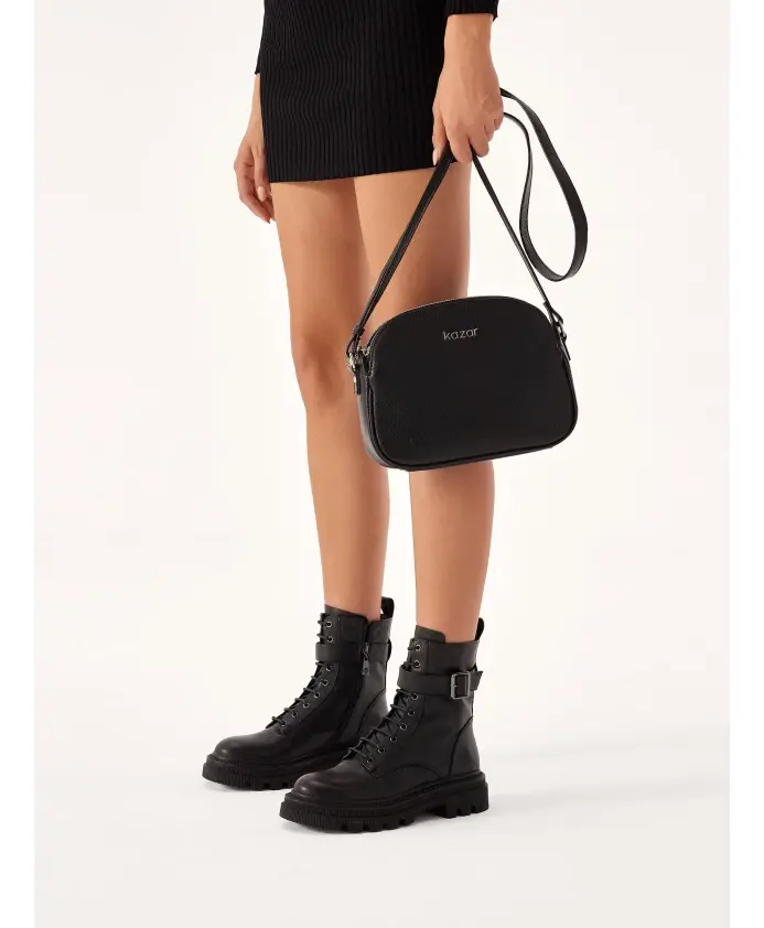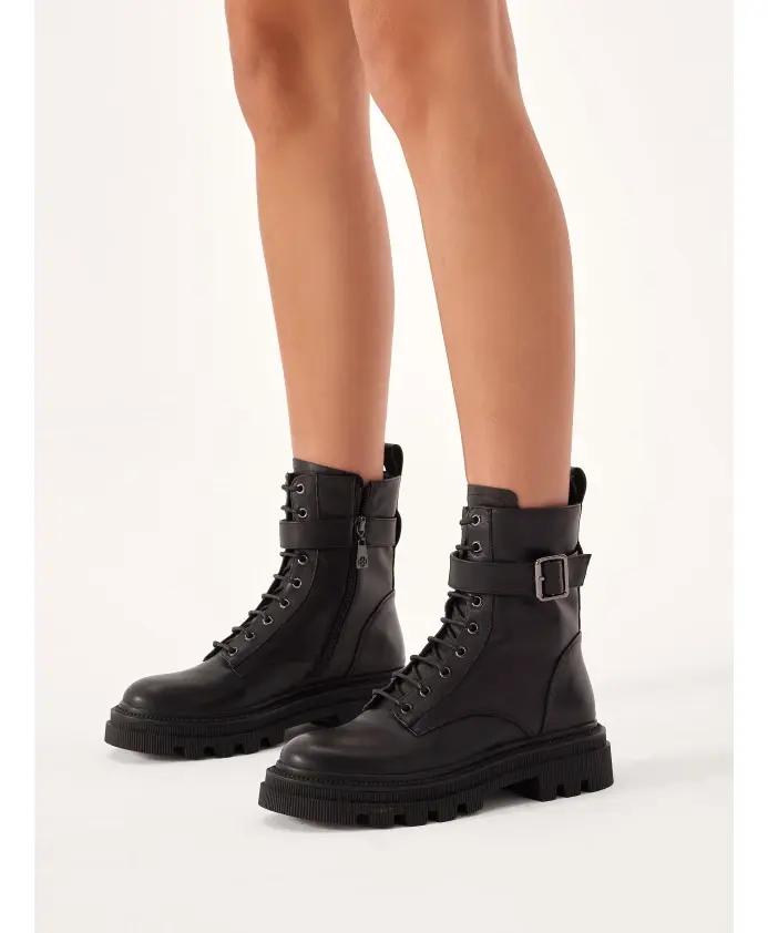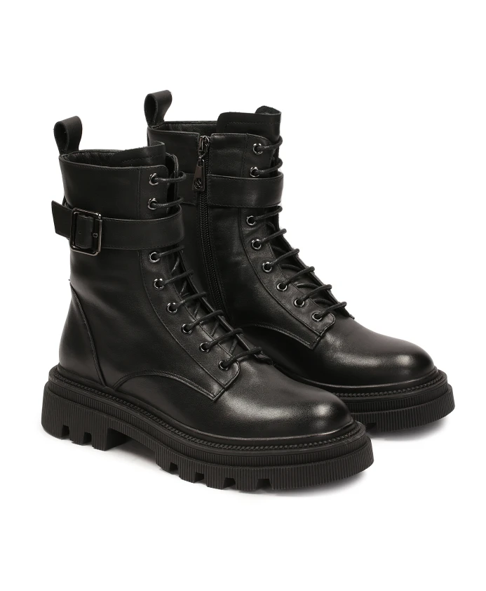 Ботинки в стиле милитари привлекают внимание толстой, заметно профилированной подошвой. Верх до щиколотки изготовлен из высококачественной лицевой кожи, прочной и гибкой. Помимо классической шнуровки, ботинки оснащены молнией для удобства надевания. Мягкая подкладка из овчины гарантирует высокий комфорт, а подкладка из тканевого меха согреет в холодные дни.