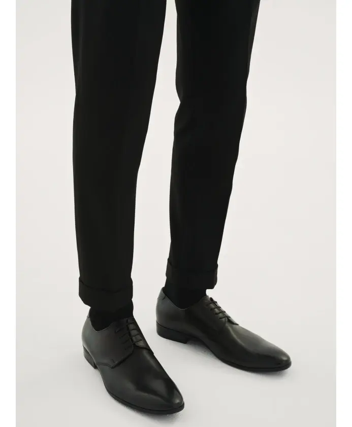 Черные мужские туфли на шнуровке из высококачественной лицевой кожи классического дизайна, с традиционной шнуровкой и закругленными носками. Высокое качество изготовления и выбор первоклассной кожи обеспечивают комфорт и настоящее удовольствие от ношения. Эта неподвластная времени модель обуви станет идеальным выбором для официальных встреч и особых случаев. Изысканный внешний вид и нежный блеск создают феноменальный образ. Нижняя часть подошвы украшена тиснением уникальной монограммы KAZAR FiForm.