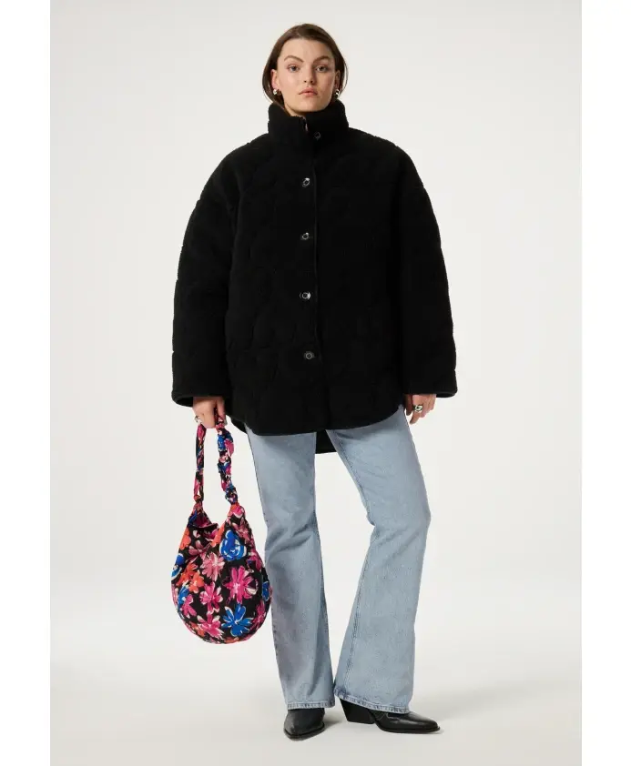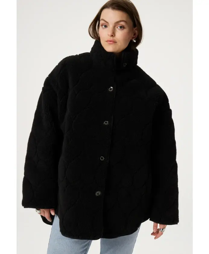 Женская куртка черного цвета из тедди-ткани с подкладкой с узором в виде сердечек и застежкой на пуговицы. Изготовленная из 100% полиэстера, эта классическая вещь для вашего гардероба будет согревать вас всю зиму.