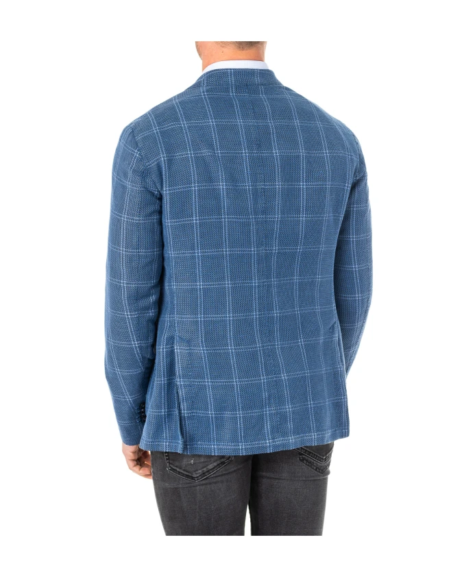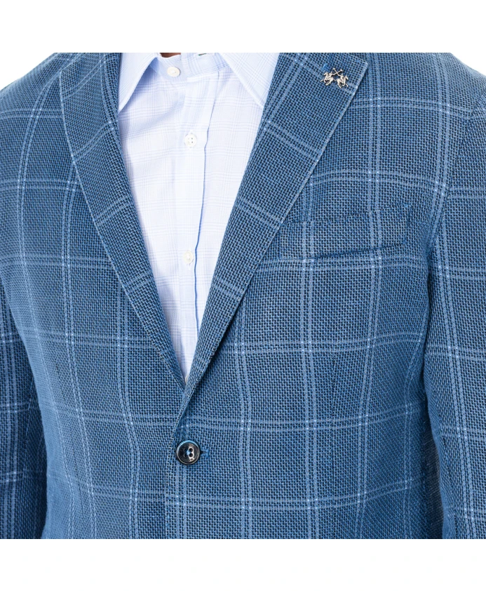 Мужской пиджак от La Martina в стиле Американа с длинными рукавами. Цвет синий, воротник с лацканами. Двубортная планка на пуговицах, два открытых передних кармана, два внутренних кармана, манжеты на пуговицах и небольшая брошь с логотипом на лацкане. Видна тональная строчка. Состав: 60% хлопок, 25% лен, 10% полиамид, 5% полиэстер. Рекомендации по уходу: Машинная стирка до 40°С, гладить при средней температуре до 130°С, не сушить в стиральной машине, не отбеливать, не подвергать химчистке.