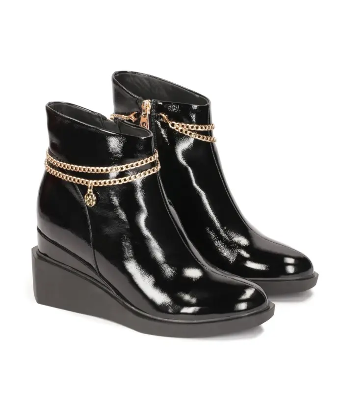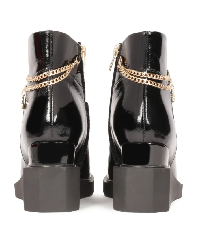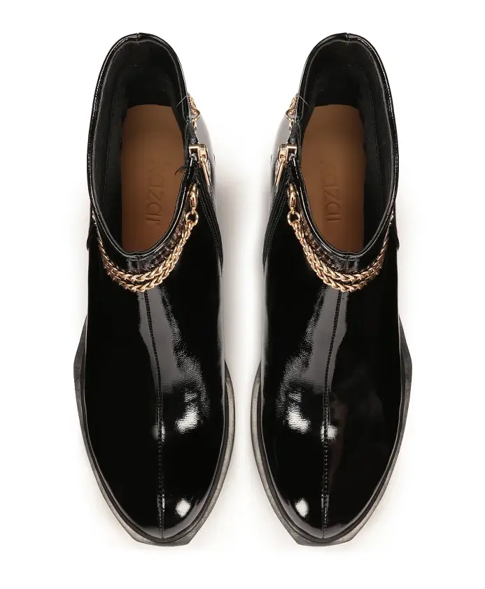 Мятые лаковые ботинки привлекают внимание оригинальным двухъярусным ботинком со скошенной лодыжкой. Этот тонкий элемент выглядит интересно на контрасте с блестящим верхом, украшенным съемной цепочкой. Авангардные ботинки на устойчивой платформе эффектно дополнят минималистичный повседневный и торжественный стиль. Внутренняя часть обуви, обитая мягкой полуанилиновой козьей кожей, гарантирует комфорт и гигиенические условия.