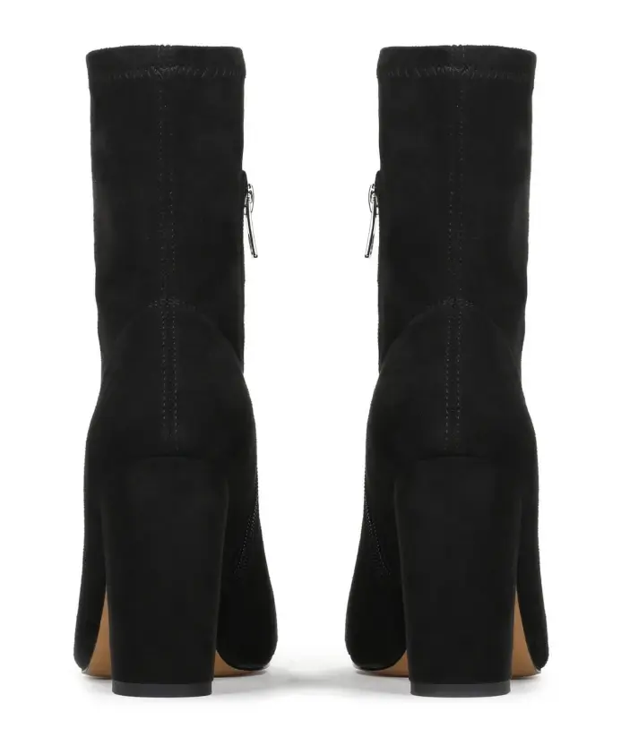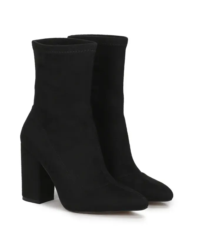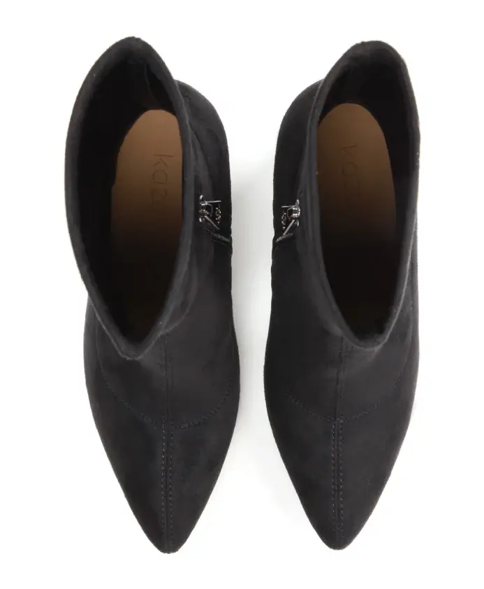 Черные ботинки из качественной ткани – это чрезвычайно женственная модель, которая красиво смотрится на ноге. Заостренный носок зрительно стройнит ногу, а высокий каблук приподнимает фигуру и подчеркивает ее достоинства. Верх без шнуровки без дополнительной застежки плотно облегает ногу, благодаря чему сапожки подходят к широким юбкам, длинным платьям и джинсам. Мягкая подкладка из овчины гарантирует исключительный комфорт. Ботинки частично утеплены тканью.