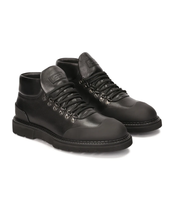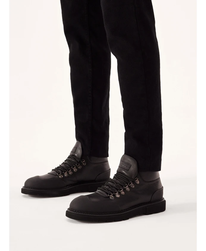 Кожаные ботинки на шнуровке — идеальное дополнение к осеннему, зимнему и даже весеннему образу. В глаза бросаются закругленные носки и каблуки, обтянутые прорезиненной кожей с матовым покрытием. Сочетание двух контрастных видов кожи и металлических ручек на шнуровке придает туфлям неповторимый характер. Внутренняя часть обуви, обитая мягкой овчиной, гарантирует высокий комфорт.