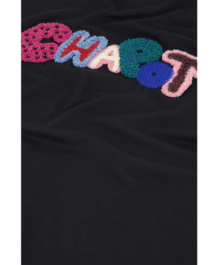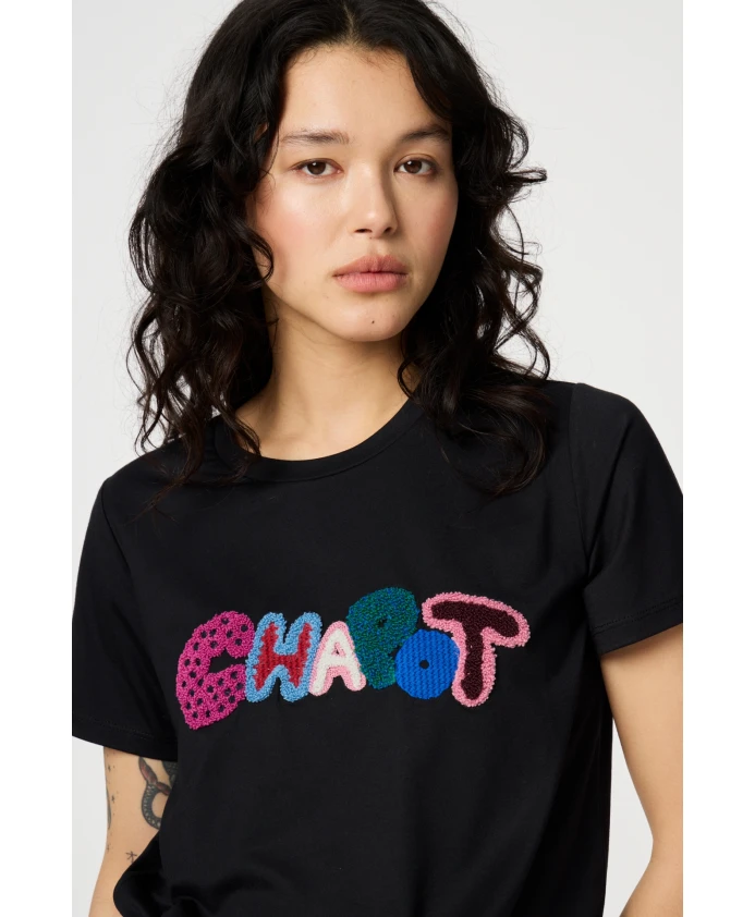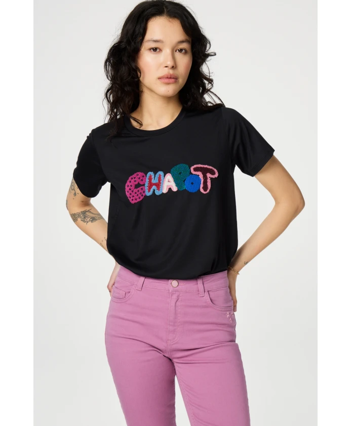 Черная женская футболка с короткими рукавами украшена вышитым принтом Chapot спереди. Футболка с круглым вырезом изготовлена из смеси 72 % модала, 21 % полиэстера и 7 % эластана. Сочетайте его с нашими джинсами Eva Flare, чтобы создать комфортный и повседневный образ.