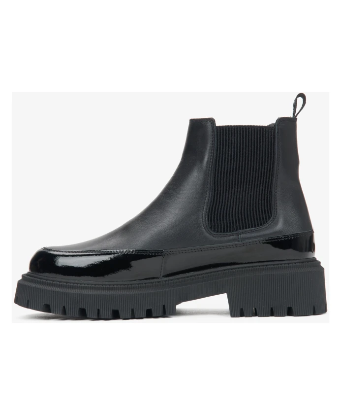 Подчеркните свой стиль с помощью наших черных женских ботинок челси! Эти ботинки, изготовленные из роскошной итальянской кожи, имеют элегантную деталь из лакированной кожи, придающую нотку изысканности. Почувствуйте комфорт и долговечность натуральной кожи и заявите о себе. Идеально подходит для любого случая.
