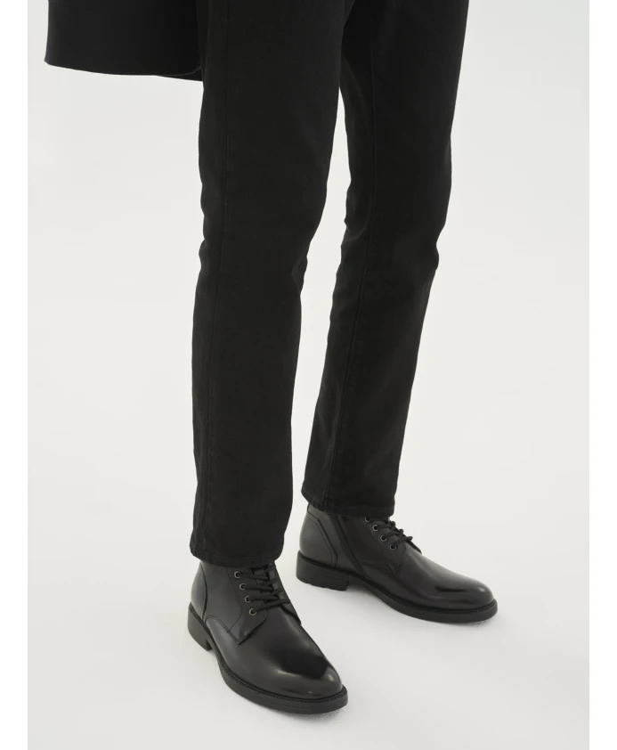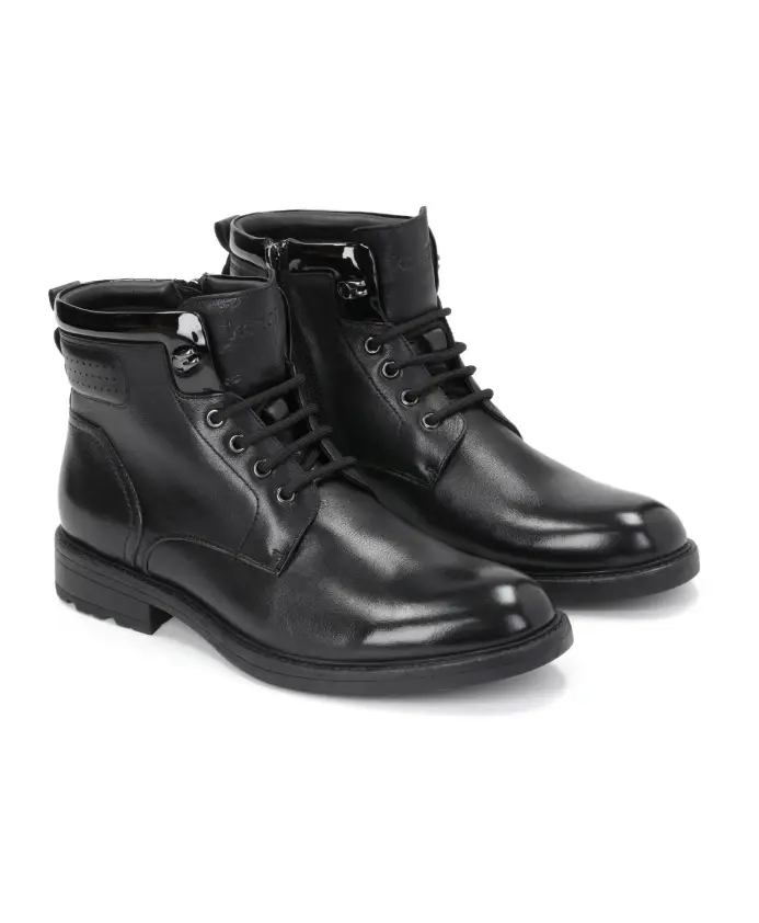 Неподвластный времени дизайн мужских ботинок чукка отличается высоким удобством ношения, эстетичным внешним видом и универсальным стилем. Голенище длиной до щиколотки выполнено из высококачественной лицевой кожи черного цвета, что делает эти туфли универсальными. Петли для шнурков на задней части обуви – интересный элемент модели. Они придают обуви повседневный и современный характер. Внутренняя часть обуви отделана текстильной тканью для комфорта и тепла.