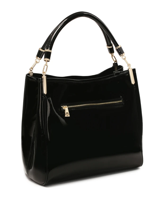 Женская сумочка из качественной лаковой кожи – это вместительная и очень практичная модель, которая пригодится в самых разных ситуациях. Мягкая и приятная на ощупь кожа делает эту сумку чрезвычайно удобной в использовании. Простой, минималистичный крой элегантно подчеркнут золотыми элементами, которые идеально гармонируют с блестящей черной кожей. Подробности о продукте: Сумка имеет основное отделение, закрывающееся на молнию. В основном отделении 2 открытых отделения и 1 отделение для хранения. закрывается на молнию. На внутренних стенках сумки 2 открытых кармана и 1 карман на молнии. В нижней части сумки расположены металлические ножки.