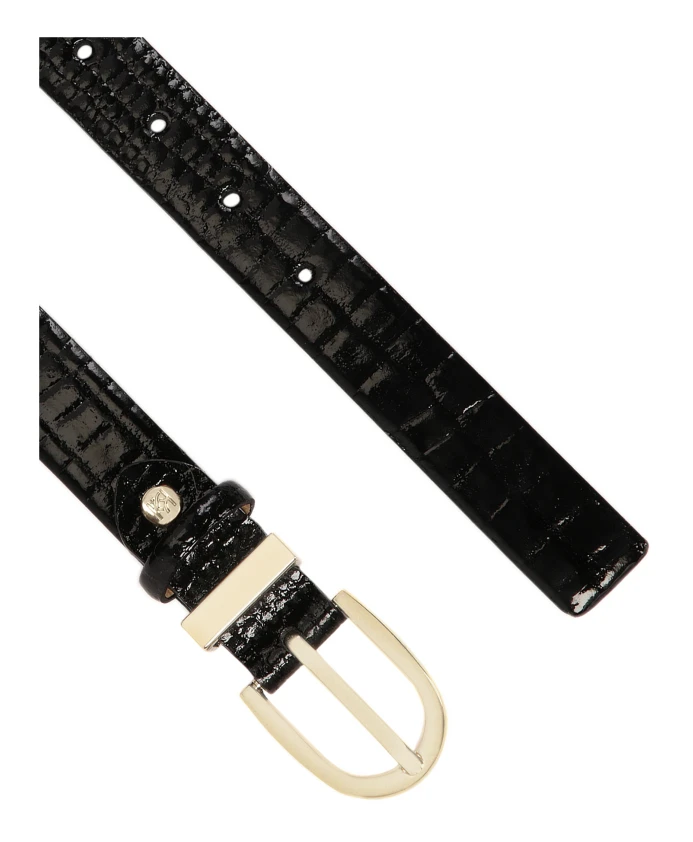 Тонкий ремень с золотистой пряжкой в виде D-образного кольца станет элегантным и функциональным дополнением к любому наряду. Ремень изготовлен из высококачественной лакированной кожи, что гарантирует долговечность и комфорт. Блестящая кожа с анималистичным мотивом и классический черный цвет делают ремень идеальным дополнением как формального, так и повседневного ношения. Золотая пряжка придает изделию тонкий гламур и современный вид, что делает этот ремень отличным выбором для тех, кто ценит стиль и элегантность в каждой детали. Ремень имеет функцию регулировки длины благодаря возможности укорачивания его за пряжкой.