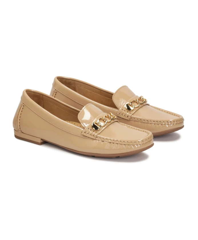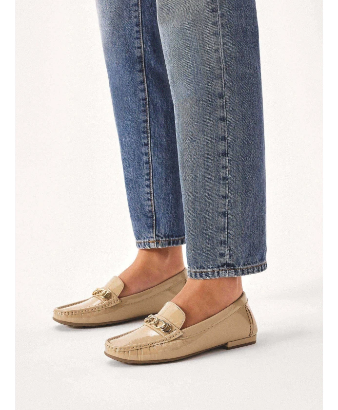 Элегантные мокасины из лакированной кожи нежного бежевого тона станут идеальной основой для самых разных стилей. Точное исполнение и отличное качество материалов гарантируют долговечность и комфорт. Металлическая цепочка золотистого цвета, ненавязчиво украшающая переднюю часть туфель, придает аристократичность и одновременно является декоративным элементом, отличающим эти мокасины от других моделей. Их дизайн сочетает в себе традиционные формы с роскошными деталями, что делает их отличным выбором для женщин, которые хотят подчеркнуть свой вкус и элегантность в любой ситуации. Внутренняя часть обуви, облицованная козьей кожей, гарантирует гигиенические условия и высокий уровень комфорта.