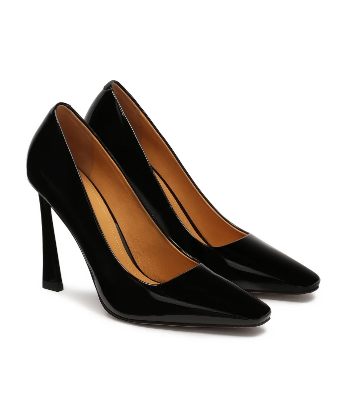 Черные лаковые туфли с квадратными носами и каблуком необычной формы – настоящая находка для любительниц оригинального дизайна и элегантности с нотками авангарда. Квадратные носы придают им уникальный характер, который отличает их от других традиционных моделей. Высокие каблуки интересной формы придают обуви некую изысканность и экстравагантность. Блестящая поверхность лакированной кожи придает им легкий блеск, что делает их идеальным выбором для вечерних прогулок или особых случаев, добавляя элегантности и очарования вашему стилю. Эти туфли-лодочки, безусловно, станут оригинальным дополнением гардероба, которое подчеркнет индивидуальный стиль и эстетическое чувство своей обладательницы. Подкладка из полуанилиновой овчины, обладающей преимуществом повышенного впитывания влаги, гарантирует исключительный комфорт. Подошва из тунисской кожи гарантирует долговечность, прочность и эстетичный внешний вид обуви.