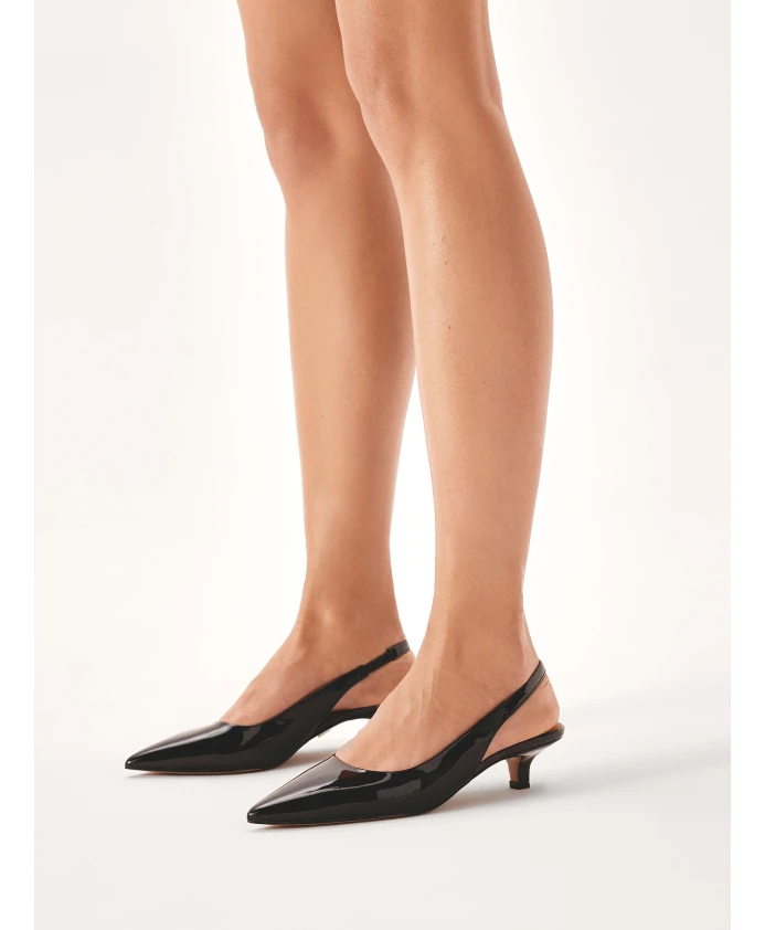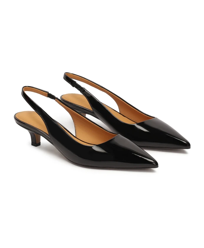 Элегантные черные туфли-лодочки на маленьком каблуке придутся по душе каждой женщине. Эти туфли имеют заостренный носок и открытую пятку, что придает им оригинальный характер. Они изготовлены из высококачественной лакированной кожи, что гарантирует их долговечность и удобство ношения. Их черная цветовая гамма придает им шик и элегантность, что делает их идеальными для вечерних прогулок или официальных мероприятий. Эти уникальные туфли наверняка станут изюминкой гардероба каждой женщины. Высокий уровень комфорта обеспечивает подкладка из полуанилиновой овчины, отличающейся отличным впитыванием влаги. Подошва из тунисской кожи отличается прочностью и эстетичным внешним видом. Он украшен металлической монограммой с черным кристаллом.