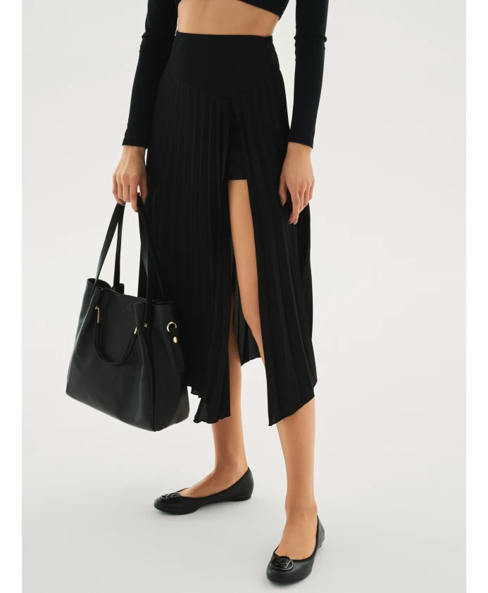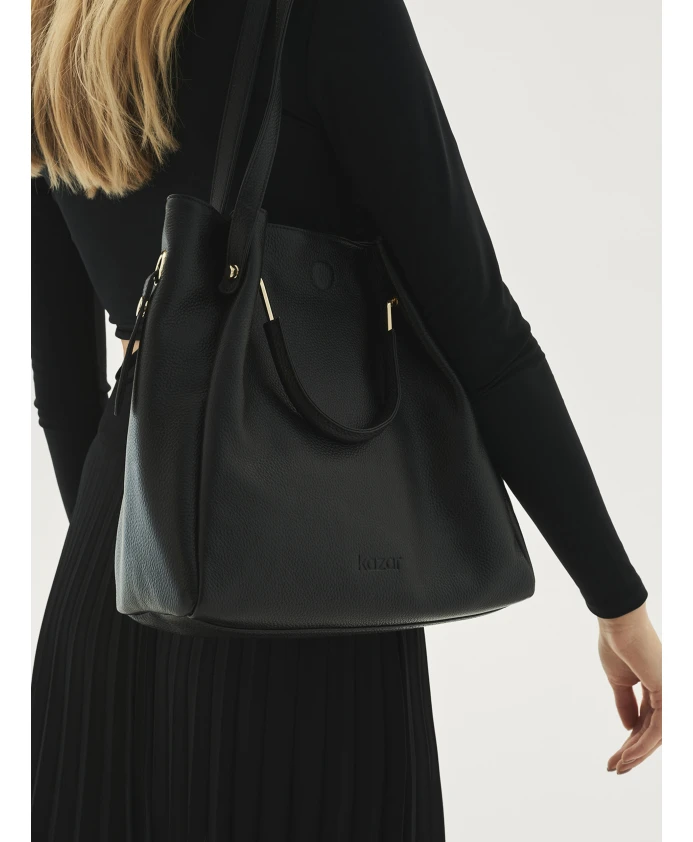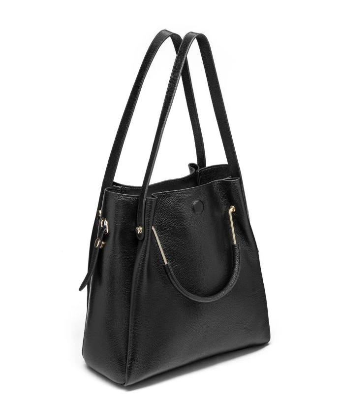 Женская черная сумка из высококачественной натуральной кожи благодаря своим размерам вмещает все необходимые вещи и даже документы. Оригинальное решение – съемное съемное отделение, которое можно использовать как косметичку. Особенности женской сумочки: 2 вида ручек, 3 отделения, в том числе 1 на молнии, 2 открытых кармана и 1 карман на молнии в среднем отделении.