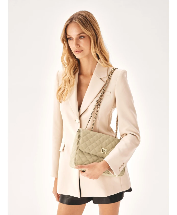 Эта женская сумка из высококачественной лицевой кожи имеет неподвластный времени дизайн и модный стеганый узор. Неповторимую красоту и элегантность этой модели подчеркивают нежный бежевый цвет и золотая цепочка на плечо. Эксклюзивный характер придает витая монограмма KAZAR, эффектно закрывающая клапан. Стильная сумочка – незаменимый элемент классического стиля. Подробности о товаре: Сумочка имеет 1 отделение, закрывающееся на молнию и клапан с поворотным замком. Внутри 1 карман на молнии и 1 открытый карман. Сзади сумки имеется 1 открытый карман. Цепочку с кожаным ремешком можно продеть через отверстия в клапане, чтобы получилась одинарная длинная ручка на плече или двойная ручка для удержания за руку.