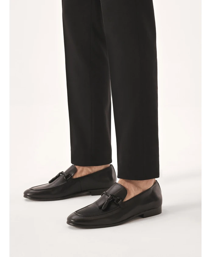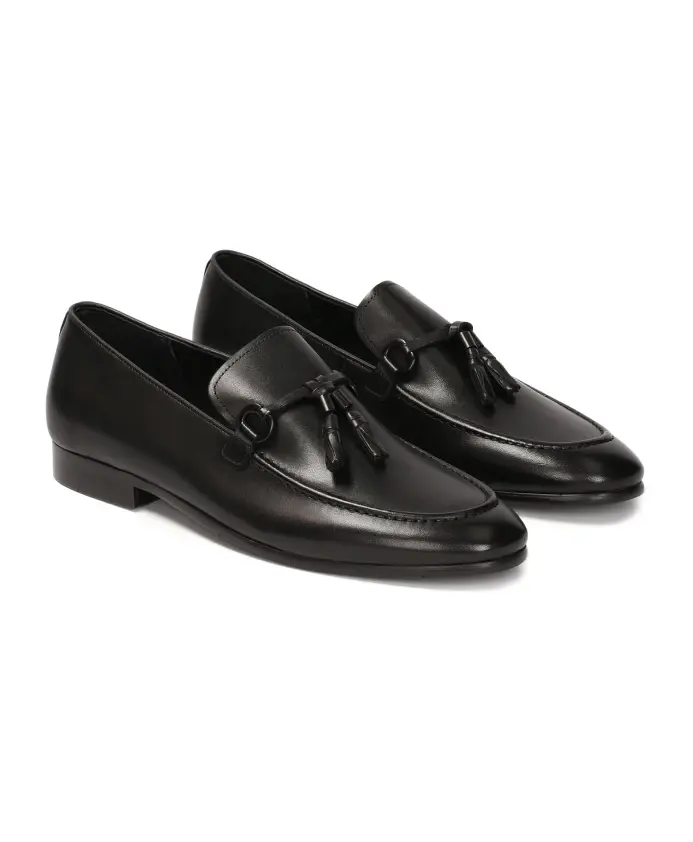 Черные тапочки из качественной лицевой кожи – модель простого, но элегантного кроя. Благодаря гибкой и прочной коже слипоны идеально адаптируются к форме стопы и гарантируют максимальный комфорт во время использования. Классические лоферы с кисточками украшены декоративными кисточками спереди. Тонкий и элегантный крой туфель подчеркнут нежным черным цветом. Их можно носить босиком или с носками. Они подходят как для повседневного, так и для более формального стиля. Эта модель понравится мужчинам, которые любят модную, но чрезвычайно удобную обувь. Внутренняя часть обуви из овчины гарантирует гигиенические условия и высокий уровень комфорта.