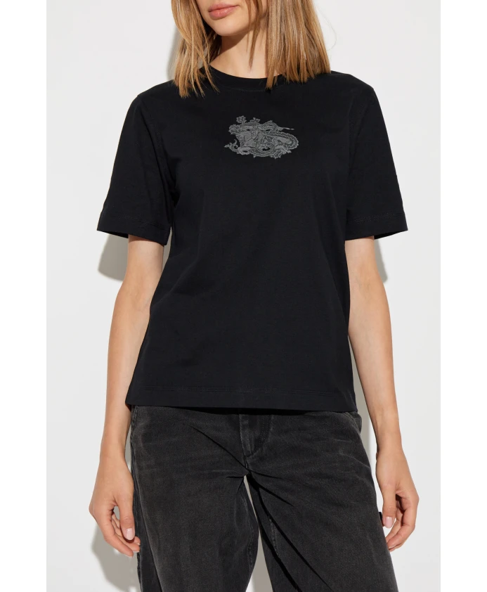 Представляем эксклюзивную ЧЕРНУЮ ХЛОПКОВУЮ ФУТБОЛКУ из коллекции Burberry, известного английского бренда с богатой историей, берущей начало в 1856 году. Эта классическая футболка простого кроя, с короткими рукавами и круглым вырезом создана для женщин, ценящих элегантность и комфорт. Центральным элементом является смелый узор, изображающий рыцаря, сражающегося с драконом, выполненный в сером цвете, который прекрасно контрастирует с черным фоном рубашки. Этот шаблон также содержит слово