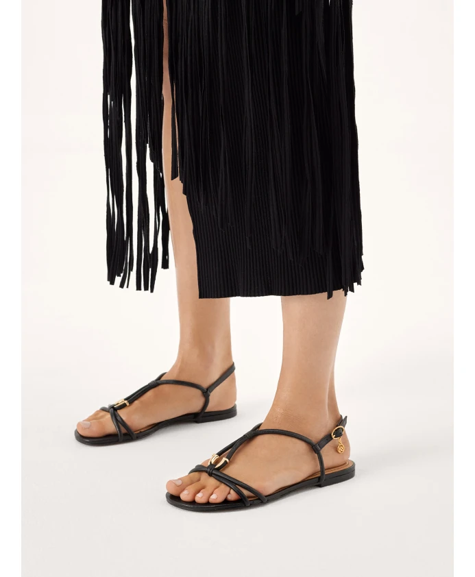 Женские босоножки на плоской подошве – привлекательная модель, которая смотрится на ноге очень утонченно и нежно. Впечатляющие мягкие ремешки из высококачественной лицевой кожи очаровательно облегают ногу вдоль средней части стопы и вокруг лодыжки. На их уникальность также повлиял свободно висящий декоративный металлический логотип KAZAR золотого цвета. Классические черные туфли добавят роскоши любому стилю, как дневному, так и вечернему. Высокий уровень комфорта гарантирует подкладка из полуанилиновой овчины, которая прекрасно впитывает лишнюю влагу.