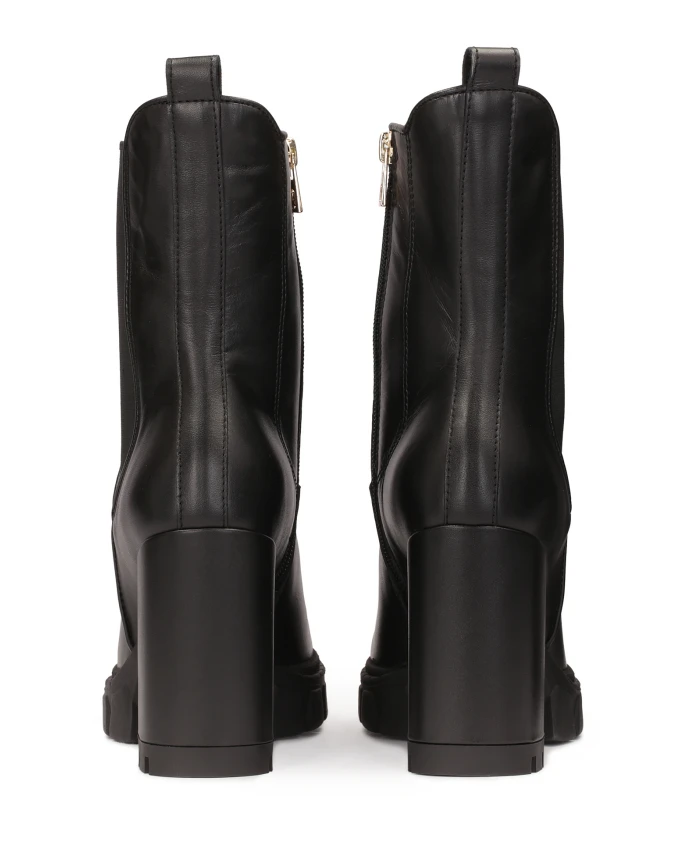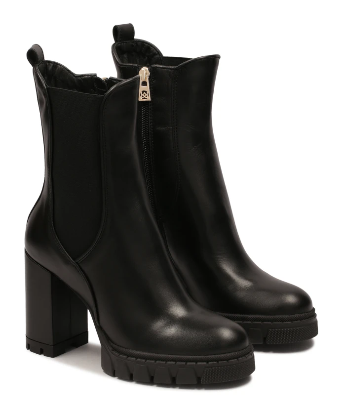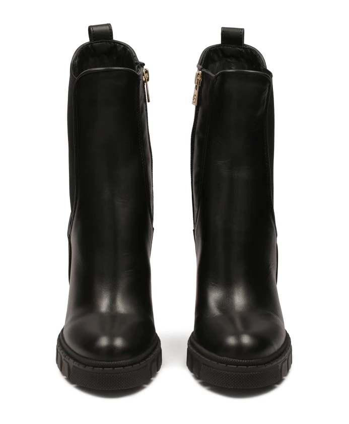 Черные ботинки из натуральной кожи соблазняют своим неповторимым стилем и исключительной элегантностью. Простое, но чувственное высокое голенище облегает ногу и подчеркивает ее стройность. Универсальность этой модели заключается в идеальном сочетании молнии и резинки, которые гармонично работают вместе, обеспечивая комфорт и идеальную посадку. Сапоги на высоком каблуке-шпильке и платформе не только добавляют элегантности, но и вневременности. Это необычное сочетание силы и чувственности, подчеркивающее любое женское творение. Мягкая подкладка из козьей кожи гарантирует высокий комфорт, а подкладка из тканевого меха обеспечивает ощущение тепла в холодные дни.