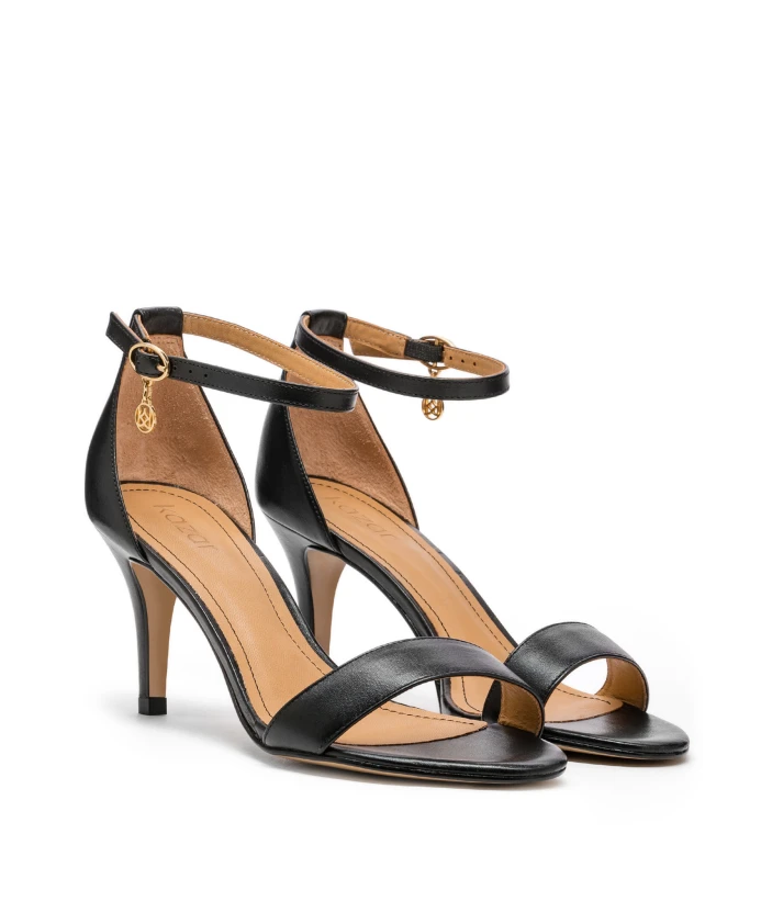 Черные женские босоножки на тонком каблуке – классическая вневременная модель, незаменимая в женском гардеробе. Они изготовлены из высококачественной лицевой кожи, что обеспечивает их безупречный внешний вид на долгое время. Очаровательная деталь – небольшая металлическая пластинка на застежке, украшенная монограммой KAZAR. Удобные босоножки универсального характера проявят себя в любой ситуации. Комфорт обеспечивает мягкая подкладка из полуанилиновой овчины, отличающейся повышенным влагопоглощением. Прочный каблук и застежка вокруг щиколотки гарантируют комфорт даже в активный день.