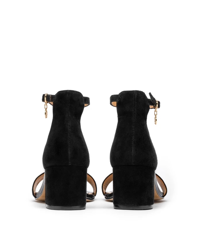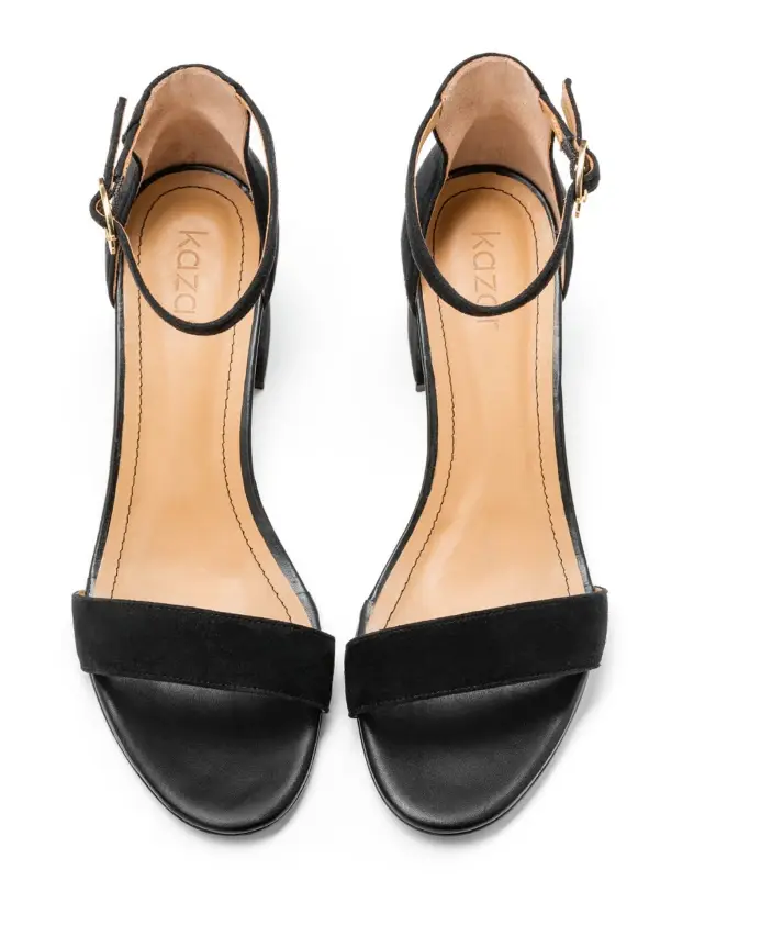 Черные женские босоножки из качественной замши представляют собой простую модель на толстом каблуке. Нежное, слегка блестящее украшение – логотип KAZAR, свисающий с застежки. Стелька из овчины обеспечивает комфорт.