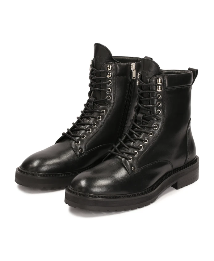Черные мужские ботинки – идеальная модель для повседневного стиля. Застежка на шнуровке обеспечивает оптимальную посадку на ноге и гарантирует эффективную защиту от осенних холодов. Туфли изготовлены из бархатисто-мягкой лицевой кожи, характеризуются простым классическим кроем, напоминающим стиль милитари. Эта модель обеспечит комфорт вашим ногам в течение всего дня.