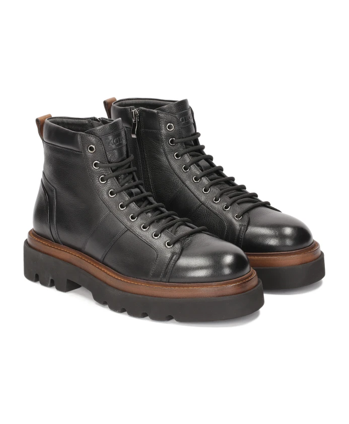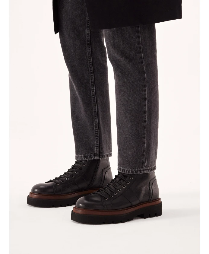 Сапоги из натуральной кожи имеют интересный и уникальный дизайн. Голенище длиной до щиколотки украшено кожаными вставками и контрастной коричневой петлей на пятке. Все это эффектно дополняет толстая двухслойная подошва, сочетающая в себе два основных цвета – черный и коричневый. Удобные, прочные ботинки – надежное дополнение осенне-зимнего образа. Мягкая подкладка из овчины гарантирует высокий комфорт, а подкладка из тканевого меха обеспечивает ощущение тепла в холодные дни. Ботинки оснащены шнуровкой и молнией.