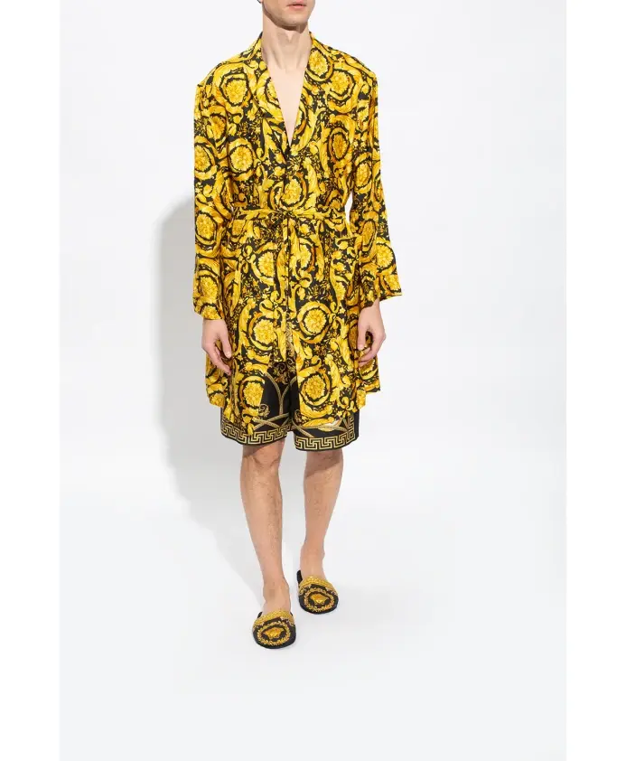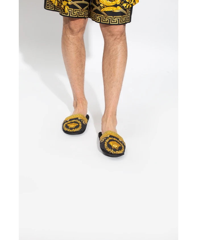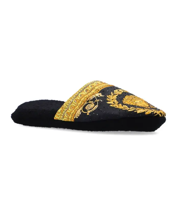 Черные тапочки от Versace Home. Эта пара, выполненная из мягкого махрового хлопка, украшена блестящими аппликациями, фирменным узором Barocco и вышивкой Medusa.