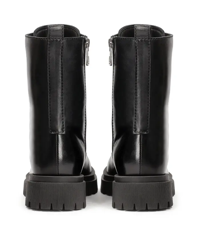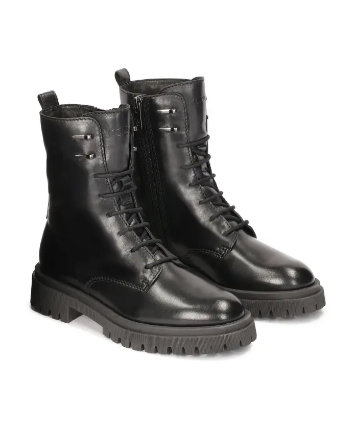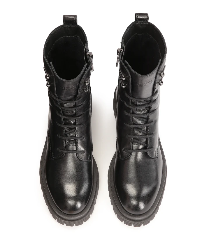 Эти ботинки, изготовленные из высококачественной лицевой кожи, имеют простую шнуровку и верх на молнии. По внешнему виду они напоминают массивные военные ботинки, хорошо показывающие себя в различных условиях. Минималистский дизайн, универсальные цвета и экономное использование украшений – признаки хорошего стиля. Утепленная модель прекрасно подойдет для осенне-зимнего сезона. Подкладка из полуанилиновой овчины обеспечивает исключительный комфорт благодаря отличным свойствам поглощения влаги.