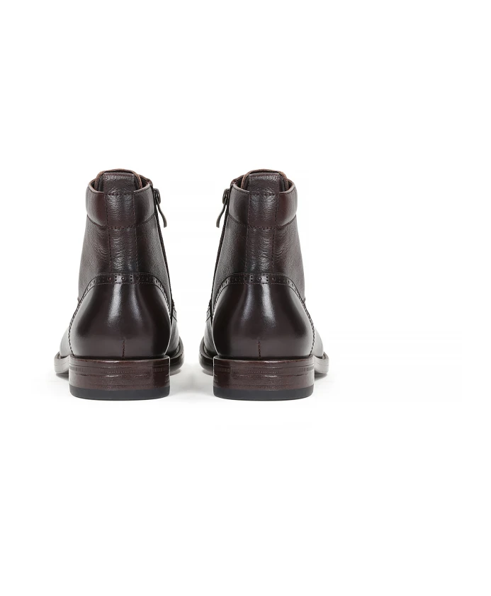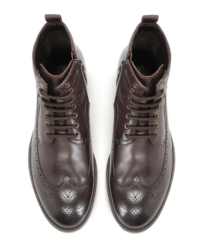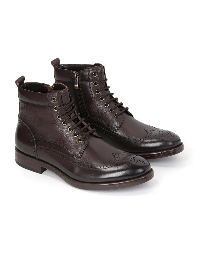 Мужские коричневые ботинки чукка из высококачественной лицевой кожи украшены богатыми украшениями в стиле броги, которые придают им уникальный и стильный вид. Центральная часть носка, то есть так называемый медальон, украшена замысловатым сетчатым узором и более темной кожей сверху возле швов. Представленная модель сочетает в себе элегантность и повседневный комфорт, что делает ее идеальной как для официальных, так и для менее формальных нарядов. Внутренняя часть обуви отделана текстильной тканью, чтобы ее было удобно и комфортно носить в холодные дни.