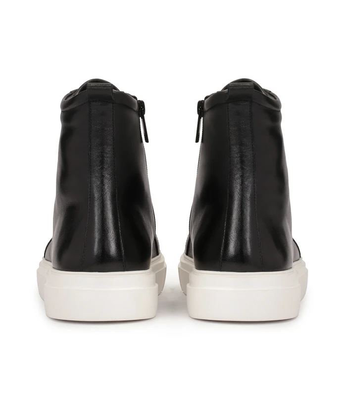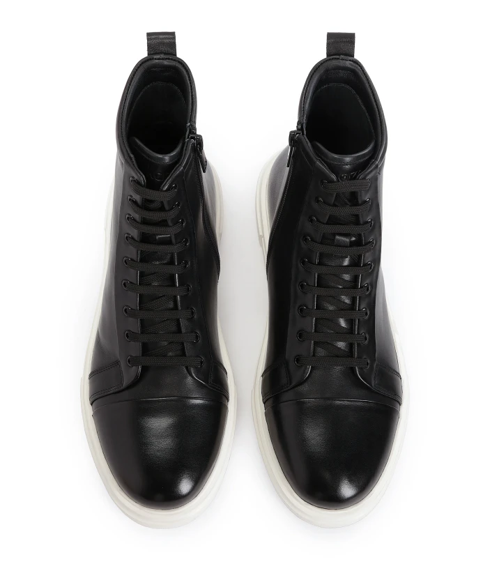 Черные кроссовки на высоком голенище из натуральной кожи – это сочетание современного стиля и функциональности. Минималистичный верх обуви придает ей универсальный характер. Туфли поставлены на плоскую подошву контрастного белого оттенка, что придает динамичный и свежий вид. Такой дизайн делает кроссовки идеальными для повседневного использования, предлагая одновременно комфорт и стиль. Голенище, оснащенное застежкой-молнией и шнуровкой, позволяет легко надевать и снимать обувь, обеспечивая точную посадку на ноге. Это делает обувь практичной и удобной, идеально подходящей для различных случаев. В задней части голенища имеется петля, которая облегчает надевание обуви и придает дополнительный шарм. Их можно носить как с джинсами, так и со спортивными ансамблями, что делает их универсальным выбором для любого мужчины, ценящего стиль и комфорт. Внутренняя часть обуви с текстильной подкладкой создает ощущение комфорта и тепла.