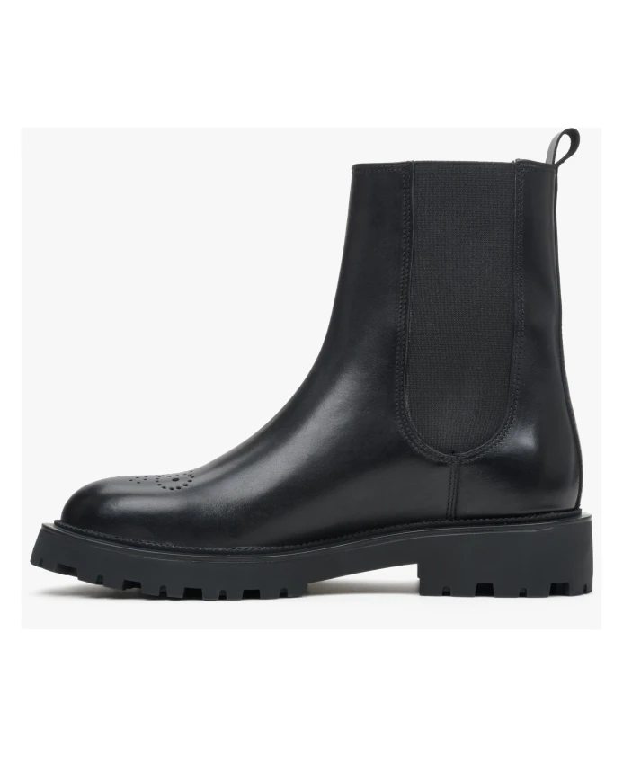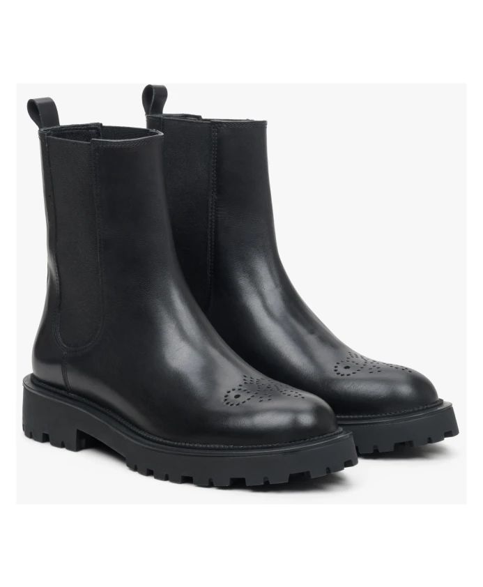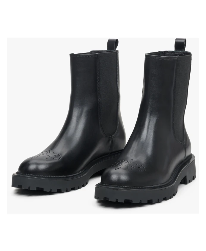 Окунитесь в мир элегантности с этими женскими ботильонами средней высоты от Estro. Выполненные из натуральной кожи элегантного черного цвета, они имеют шикарный и изысканный дизайн с декоративной перфорацией, а ботильоны в стиле «Челси» делают их удобной, но элегантной парой обуви, которая легко дополнит любой наряд — идеально подходит для сочетания с джинсами и одеждой. любимое платье.