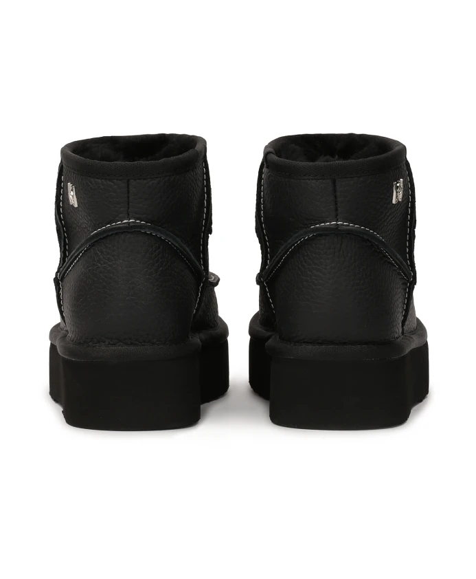 Черные зимние ботинки без шнуровки из натуральной кожи — это элегантные и функциональные зимние ботинки, сочетающие в себе стиль и комфорт. Верх украшен рельефной строчкой, придающей интересный и современный вид. Эти декоративные швы тщательно обработаны и демонстрируют высокое качество исполнения. В качестве дополнительного штриха контрастные белые нити подчеркивают линии обуви. Конструкция без застежки позволяет легко надевать и снимать, что чрезвычайно практично в повседневной жизни. Толстая подошва обеспечивает сцепление и изоляцию от холода. Внутри сапоги на подкладке из мягкой и теплой овечьей шерсти.