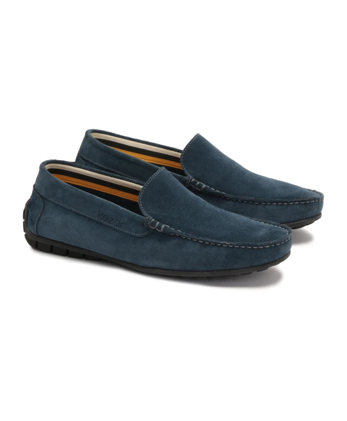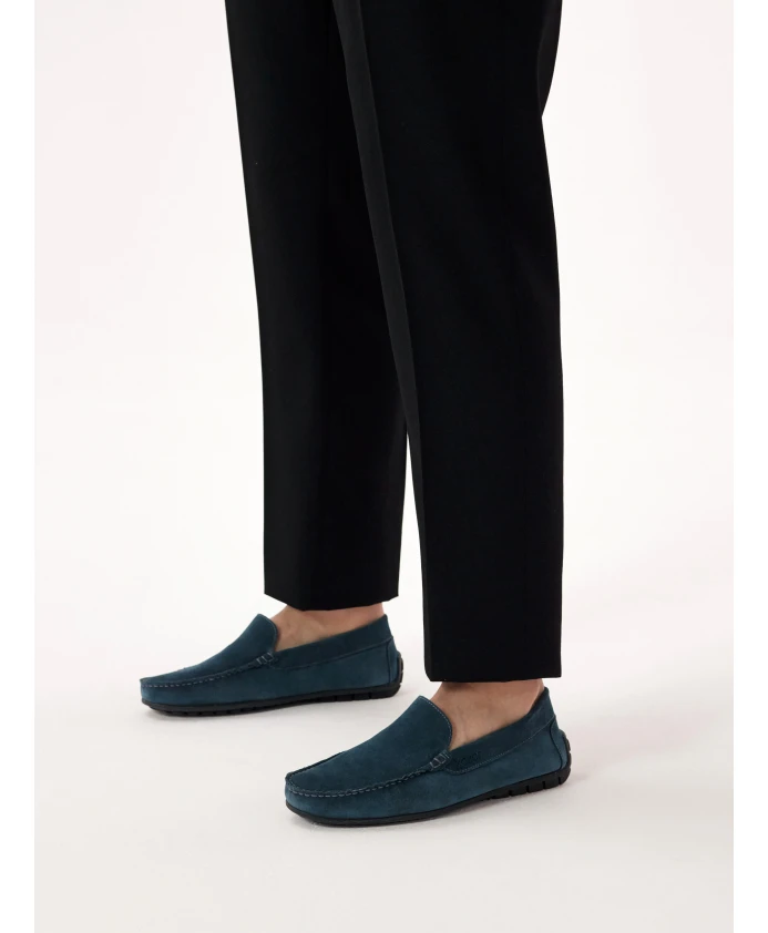 Удобные мужские мокасины из прочной замши синего цвета имеют характерный крой, подчеркнутый стежкой вокруг пальцев. Эластичная подошва с протектором превращает ходьбу в этой обуви в настоящее удовольствие. На босу ногу они прекрасно смотрятся в сочетании с чиносами и джинсами. Подкладка выполнена из нежной овчины и обеспечивает максимальный комфорт при ходьбе.
