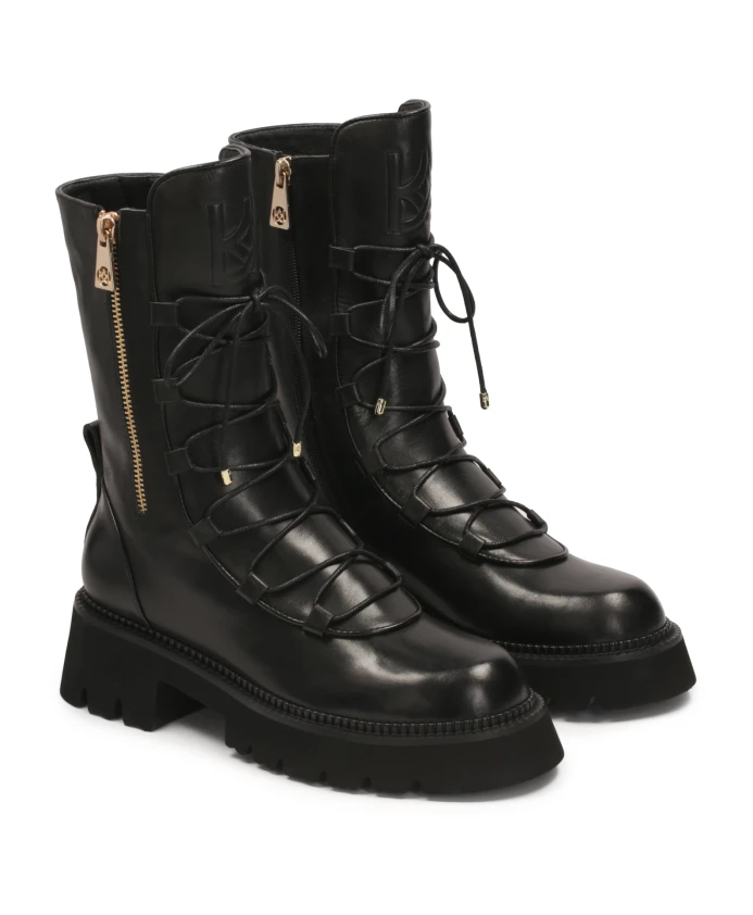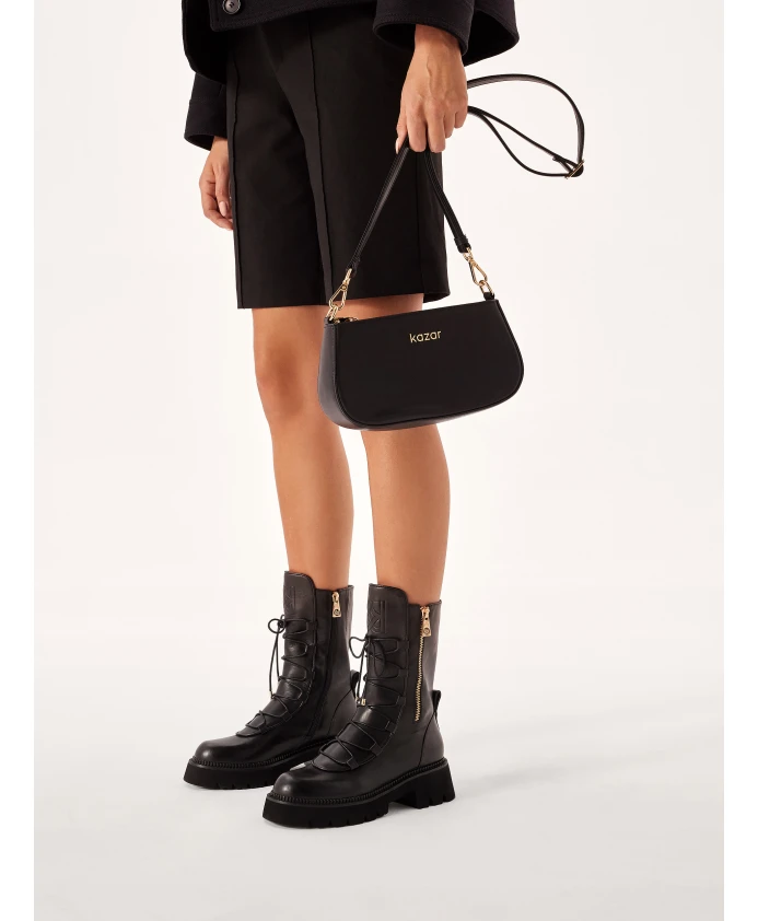 Facedleatherboots – модель, отличающаяся легкой и удобной конструкцией. Высокая голенища оснащена двумя молниями: одна служит для застежки, другая – просто для украшения. Внимание в этой модели привлекает эффектный язычок, пришитый к голенищу с рельефной монограммой KAZAR. Удобные, защищающие от холода ботинки – незаменимая вещь осенью и зимой. Подкладка из мягкой полуанилиновой овчины гарантирует высокий комфорт, а тканевая меховая подкладка обеспечивает ощущение тепла в холодные дни.